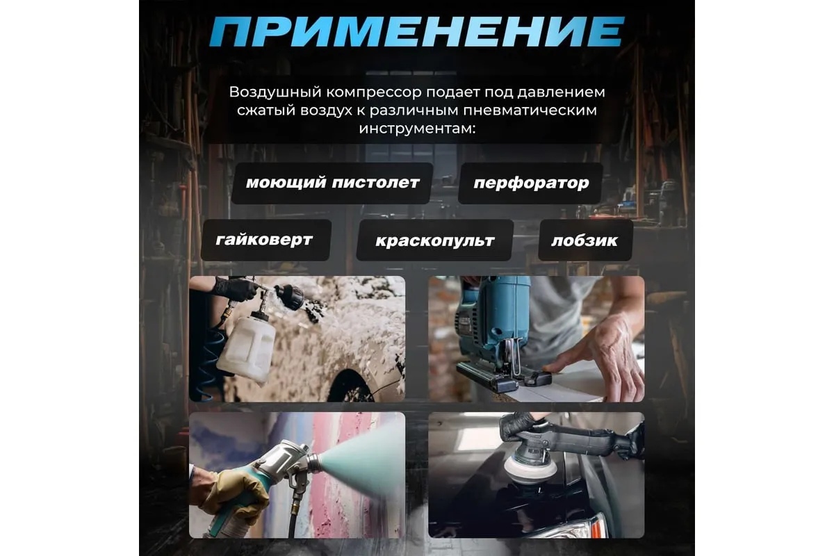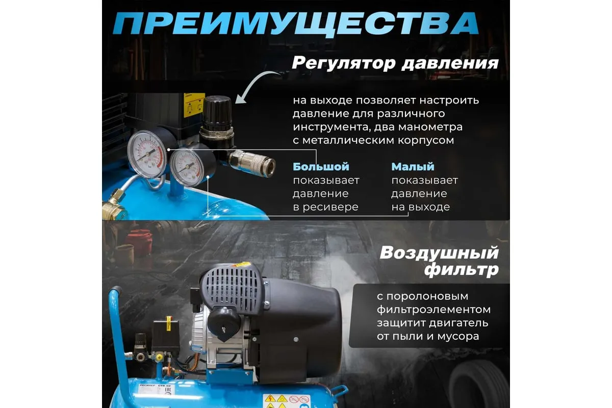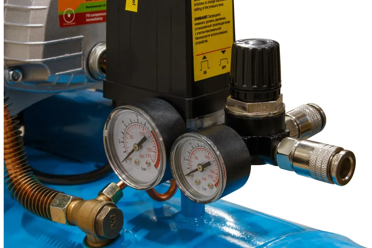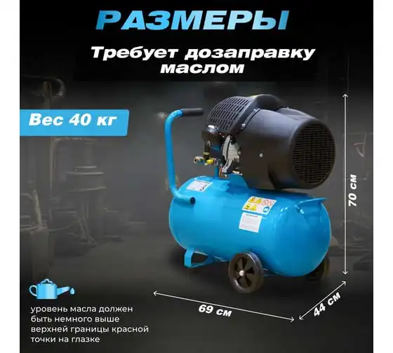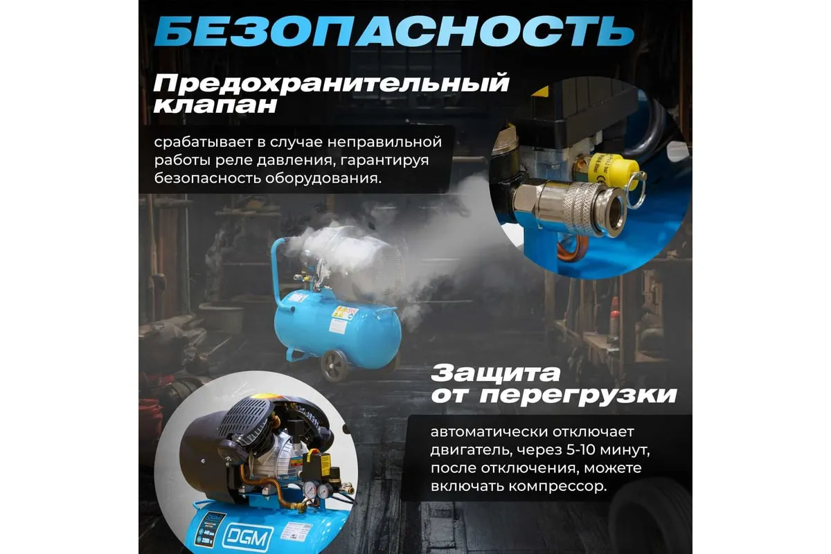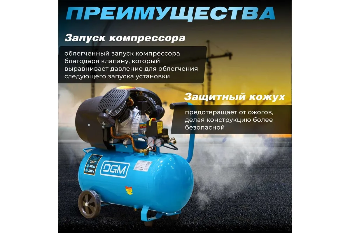 Компрессор DGM AC-254 представляет собой мощный инструмент для производства сжатого воздуха. Особенностью конструкции является наличие колес. Компрессор можно перемещать по горизонтальной поверхности с минимальным усилием. Также для этого установлена тяговая рукоятка. Двойной манометр позволяет отслеживать уровень давления на выходе с компрессора и входе в инструмент. Дополнительно можно установить фильтр для очистки от масла -увеличит ресурс подключаемого оборудования. Высокая мощность и внушительная вместимость ресивера обеспечивают стабильную работу в любых условиях. Если требуется кратковременная подкачка, то необязательно запускать двигатель. Достаточно запасов воздуха из ресивера.