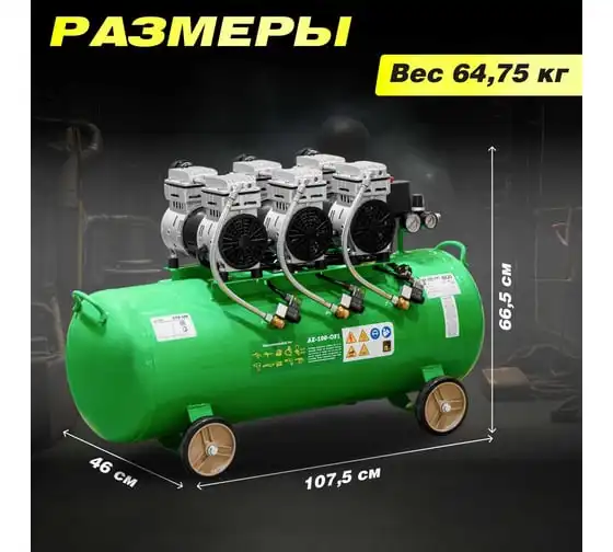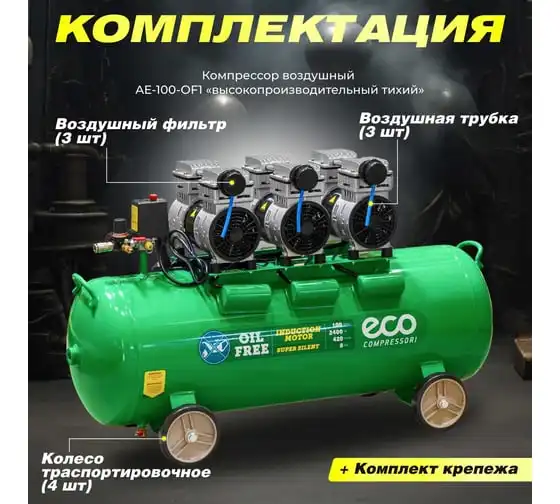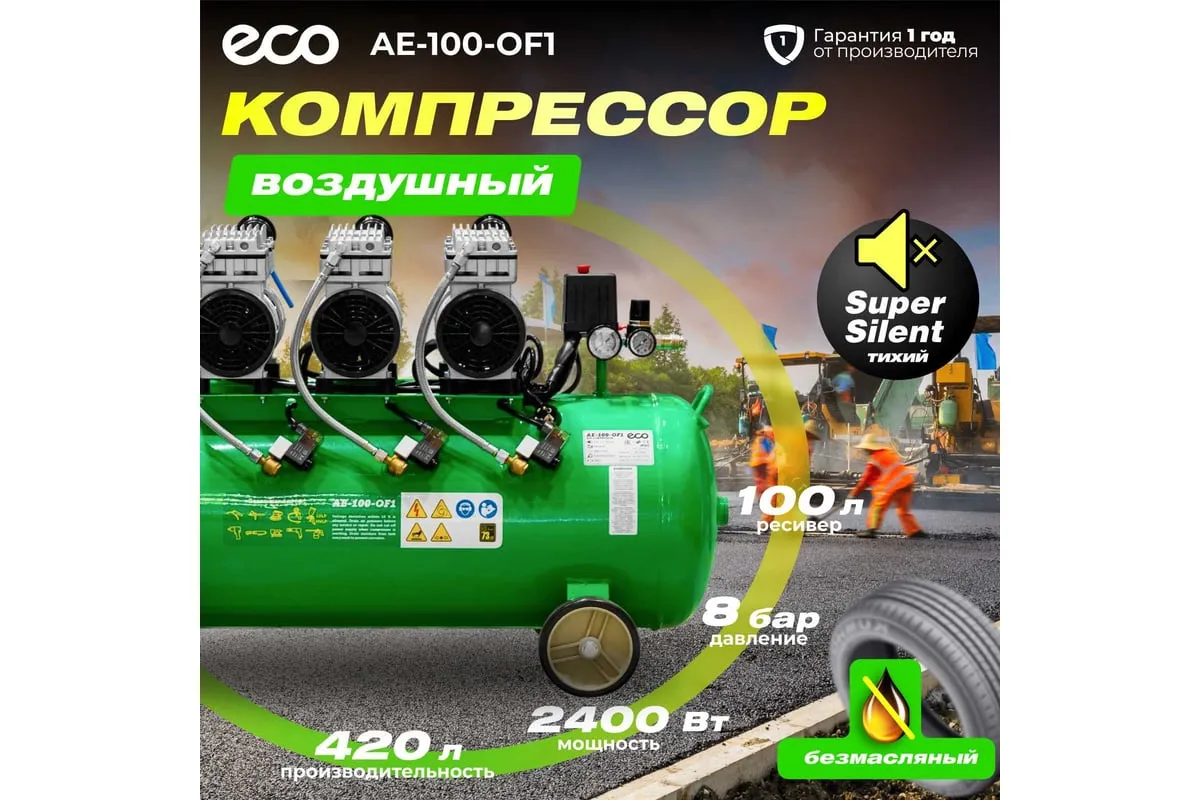 Компрессор безмасляный ECO AE-100-OF1 (EC2610-1) для использования не требует заливки масла.