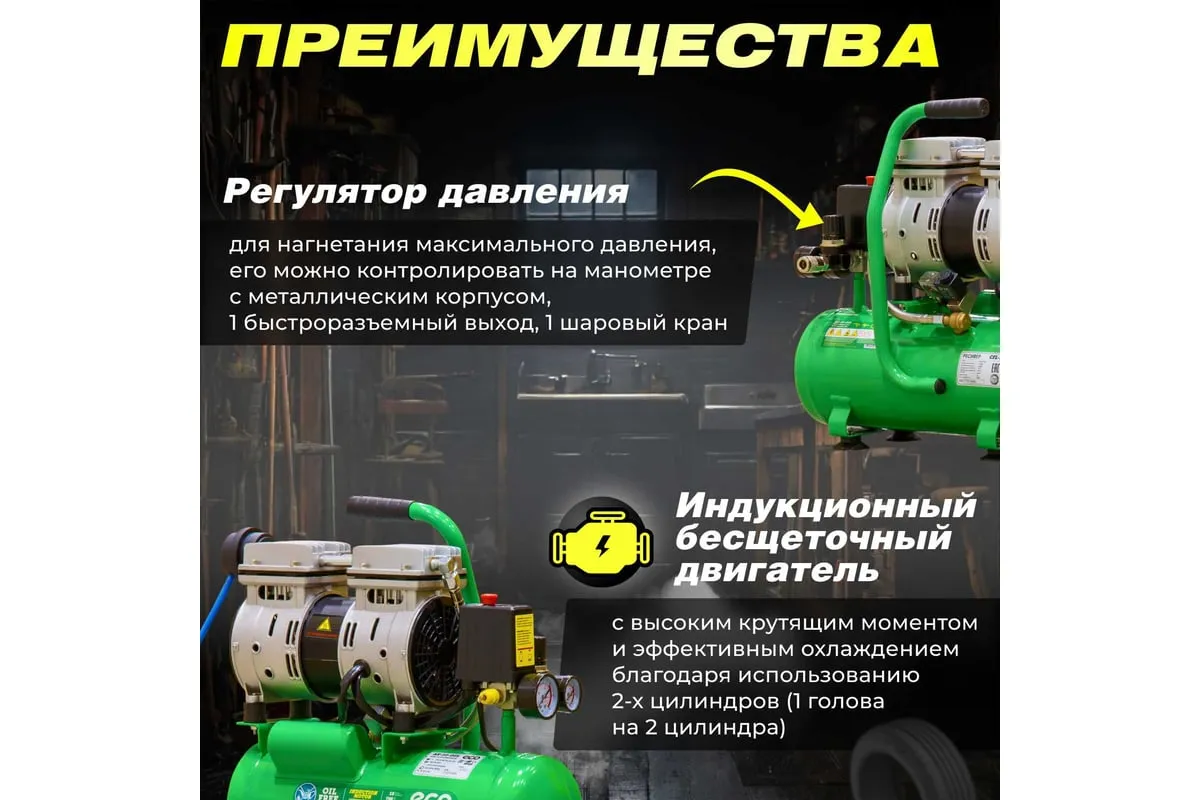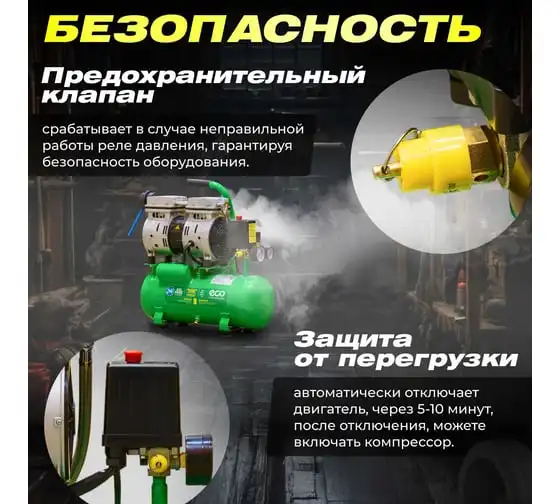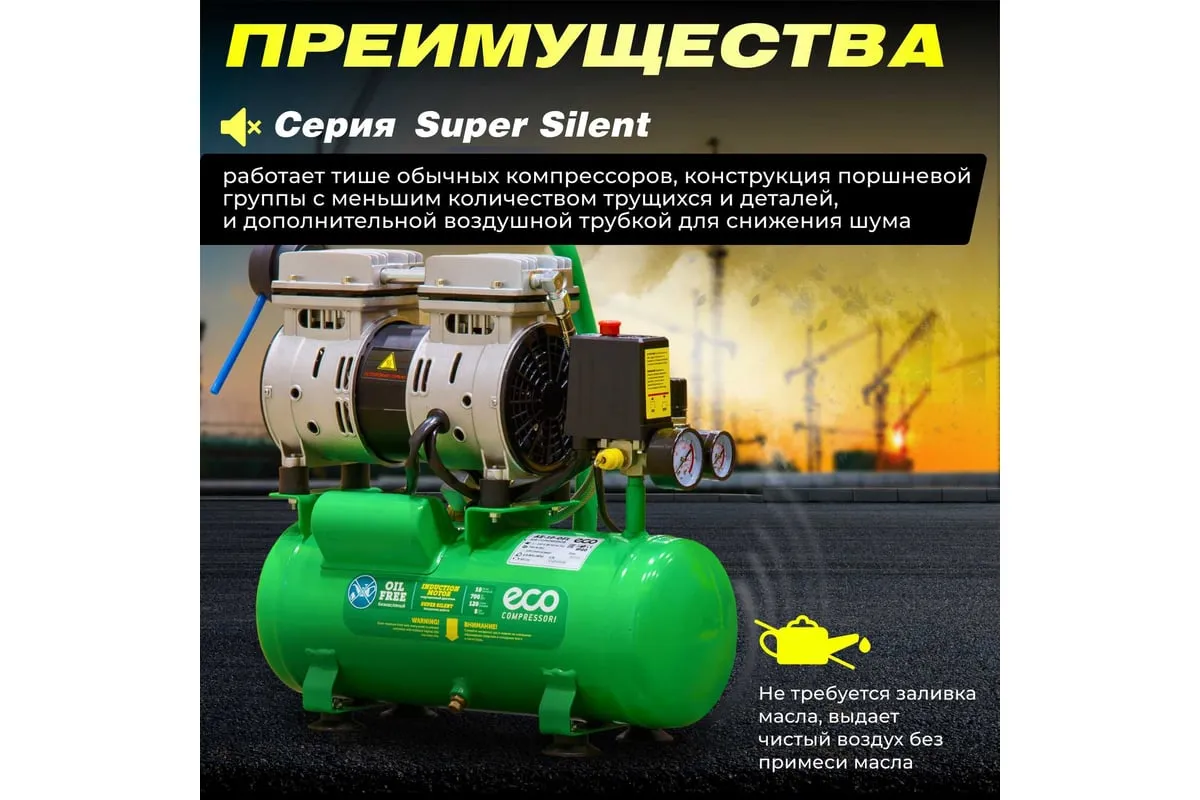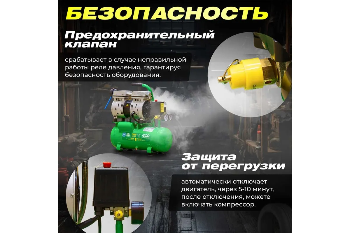 Компрессор ECO AE-10-OF1 предназначен для сжатия воздуха и подачи его в нужном направлении. Подходит для бытового использования в гараже или на даче.