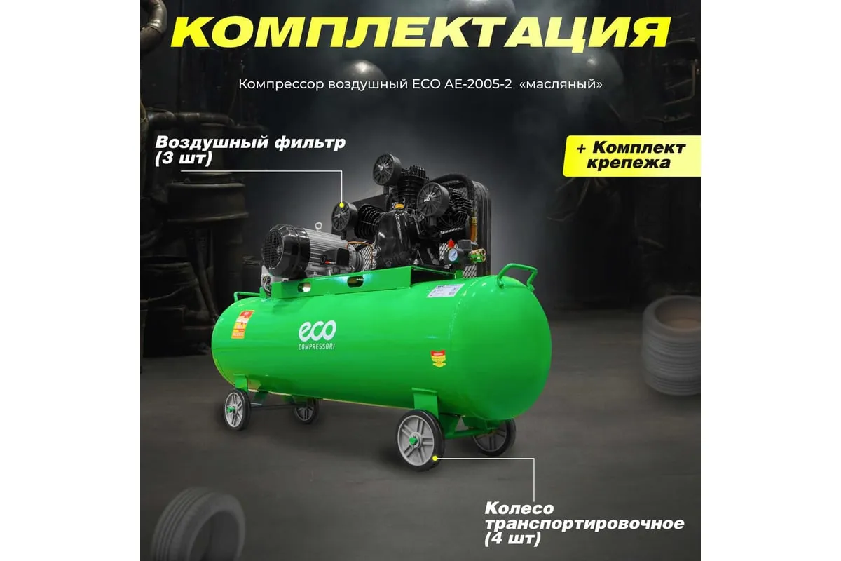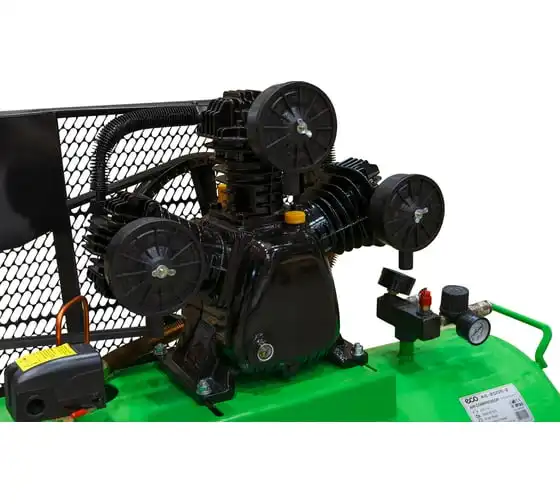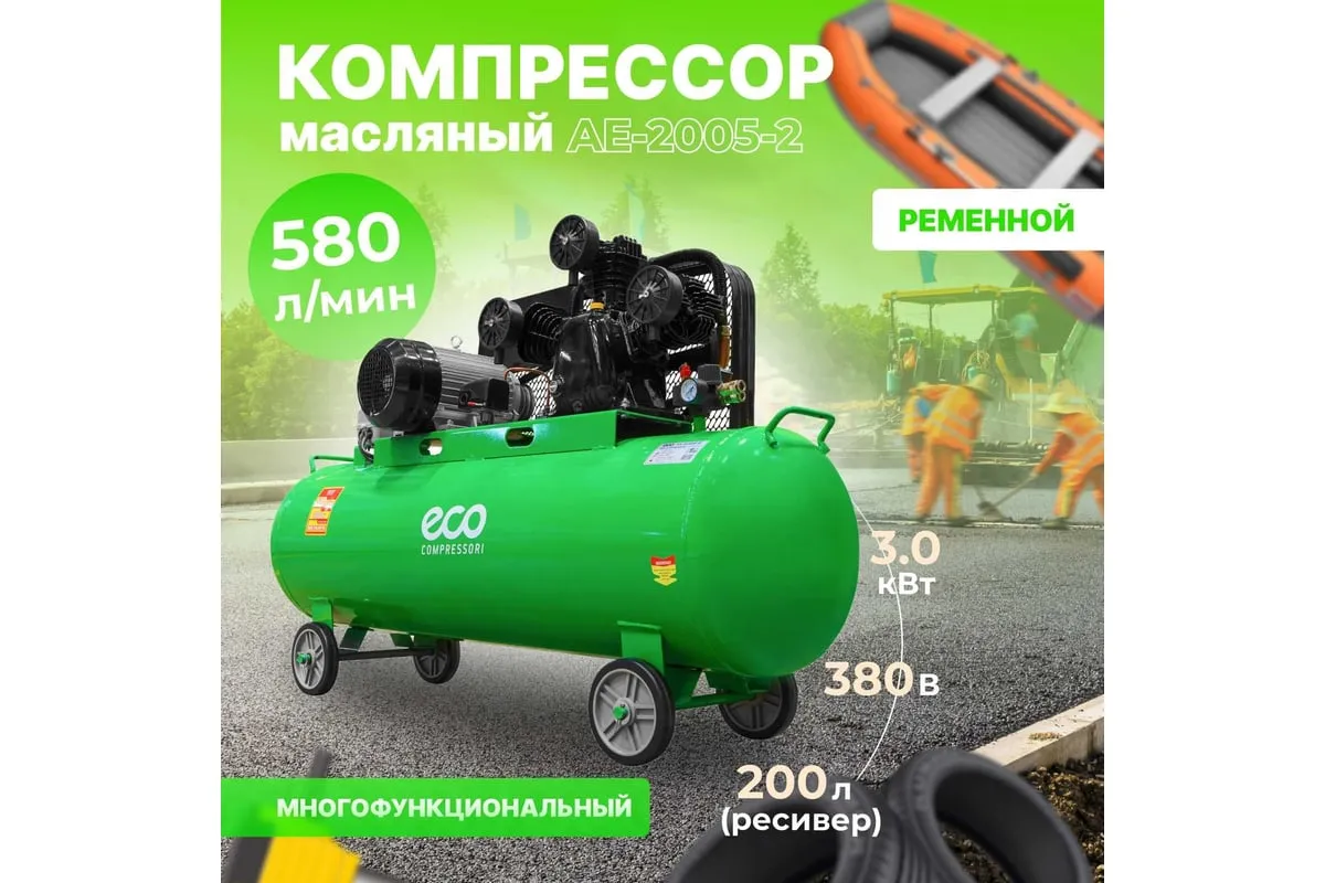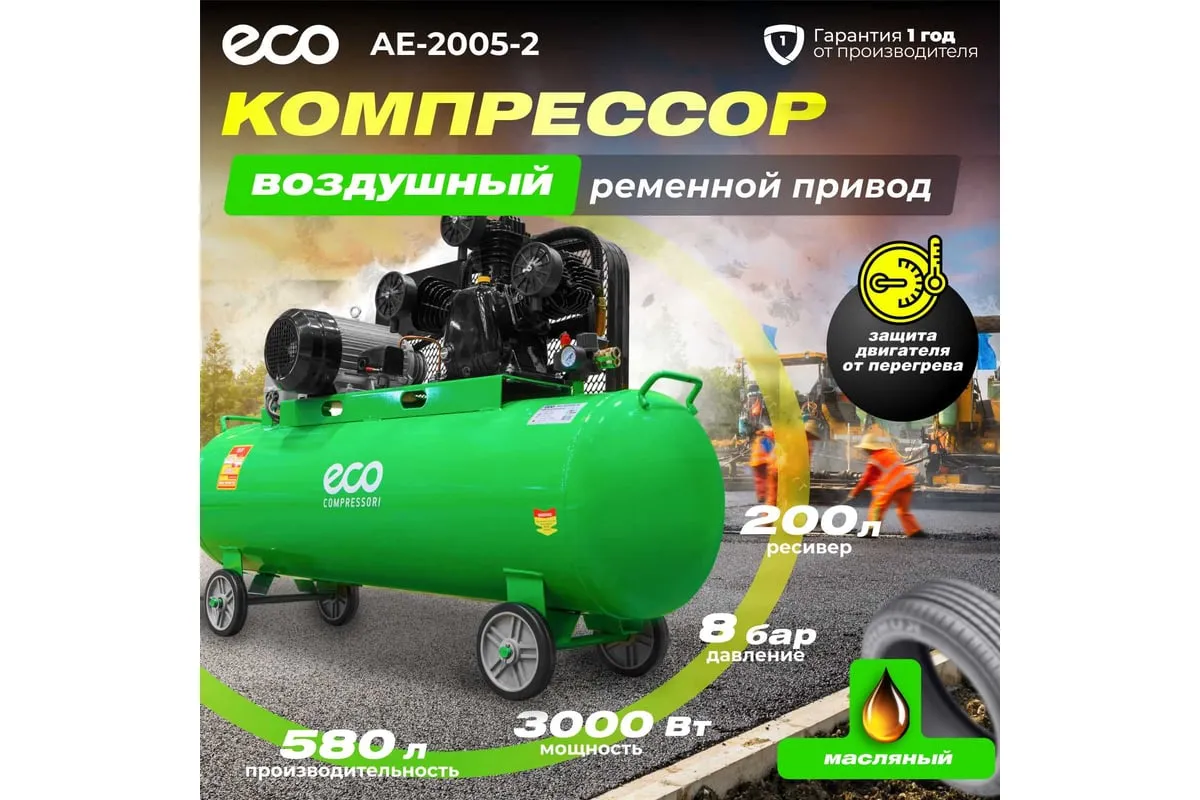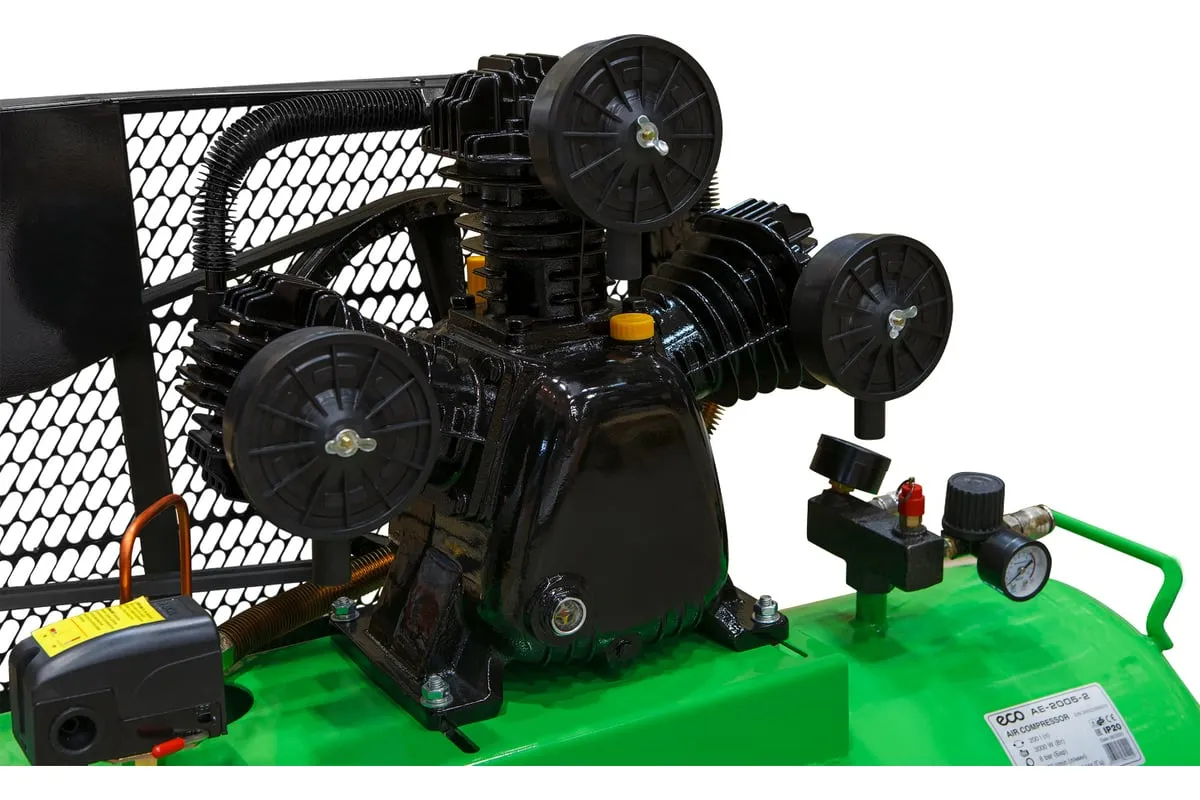 Компрессор ECO AE-2005-2 представляет собой мощный инструмент для производства сжатого воздуха. Ременной привод защищен металлической сеткой. Это позволяет безопасно работать.