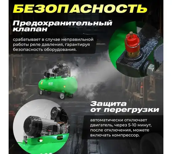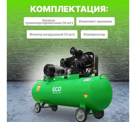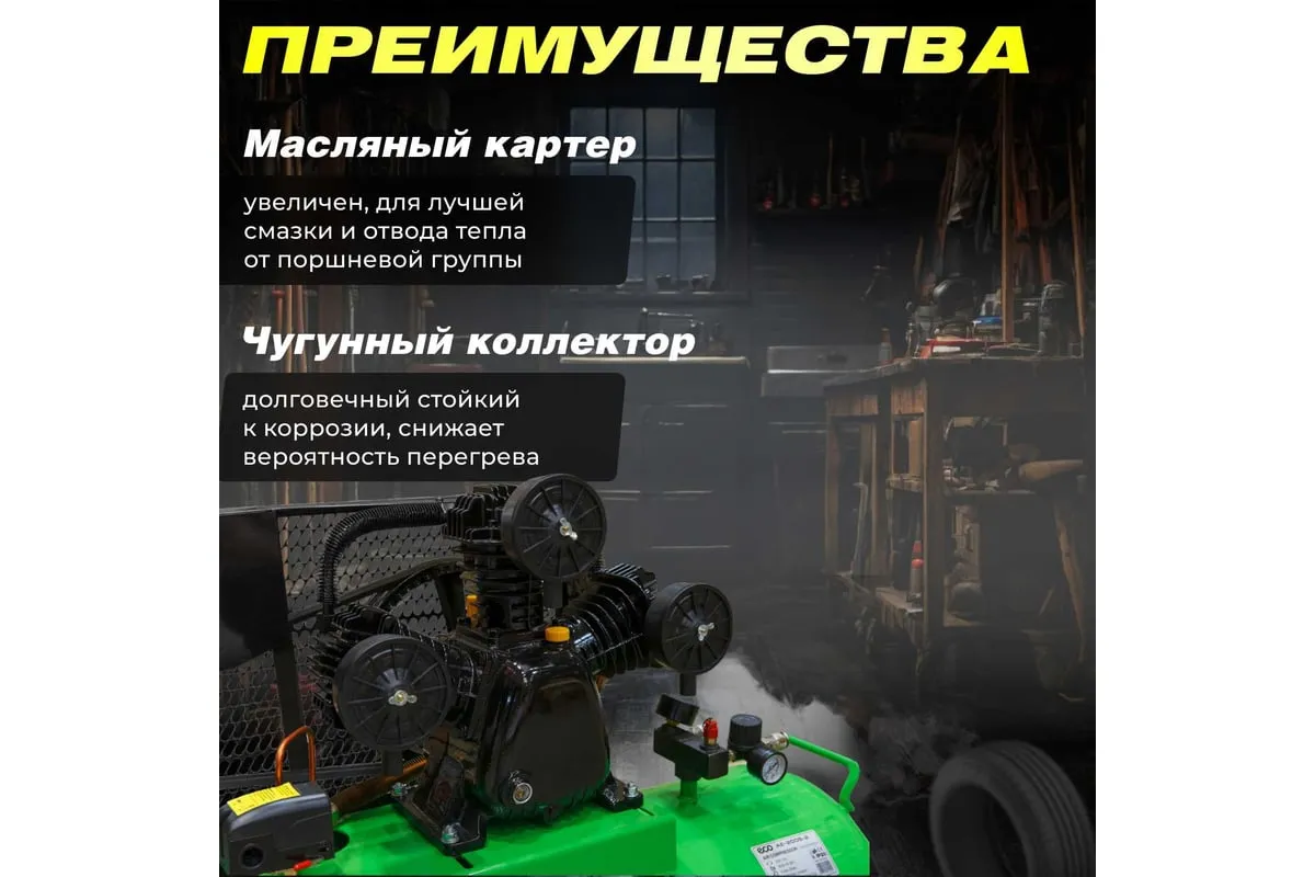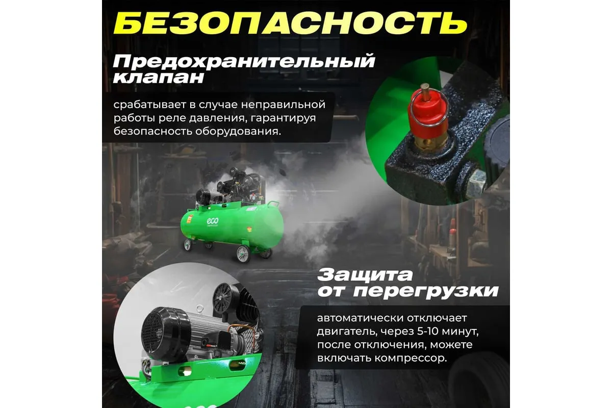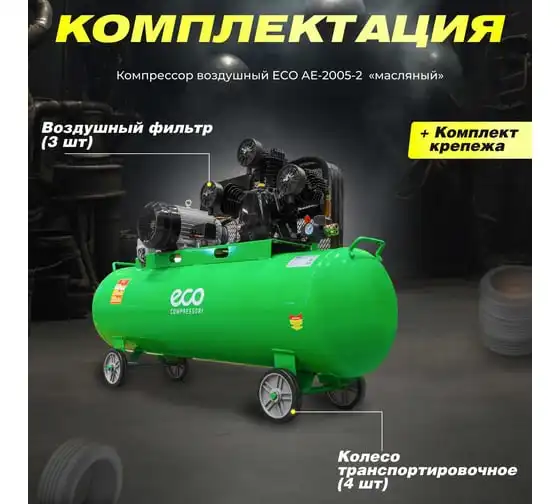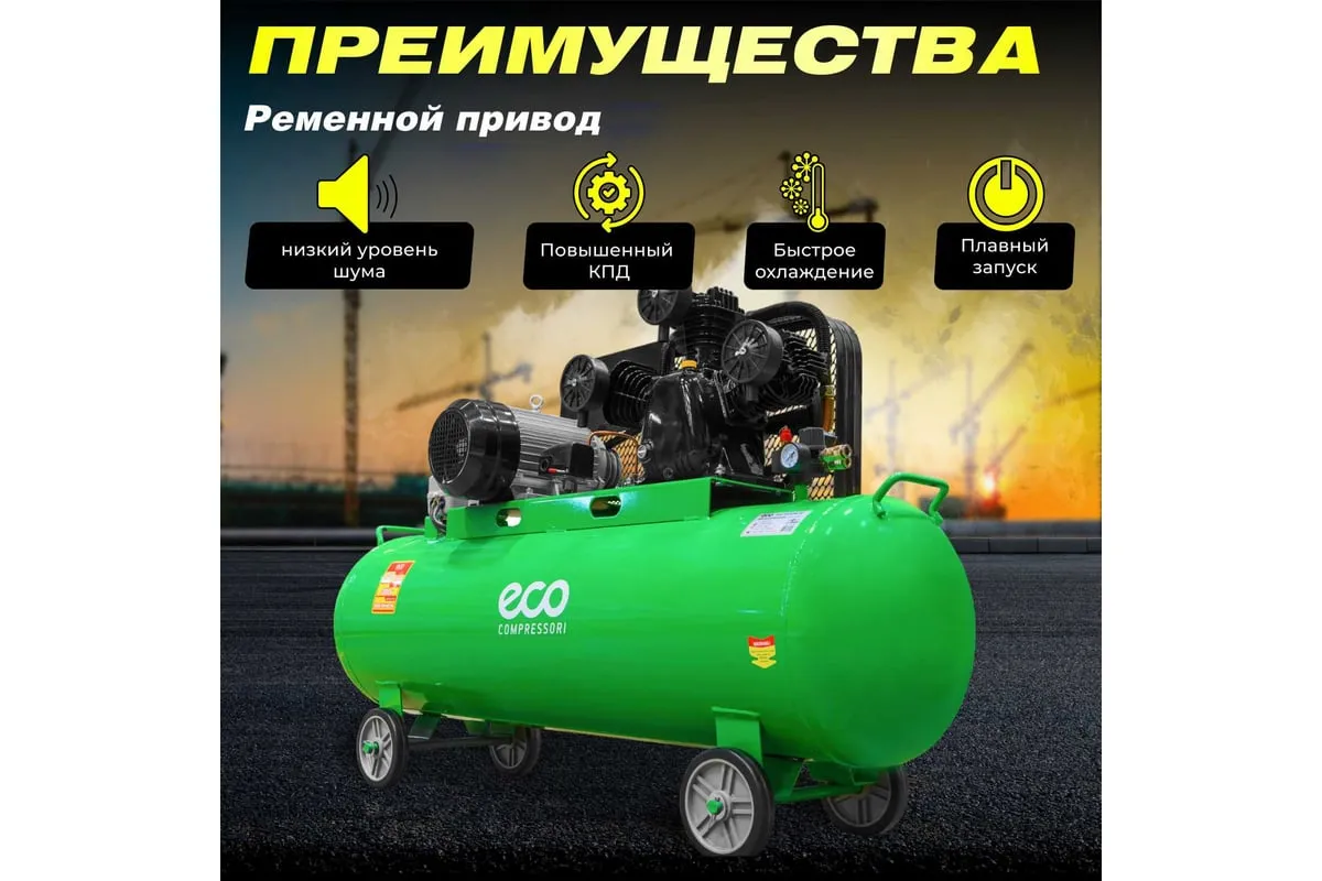 Компрессор ECO AE-2005-2 представляет собой мощный инструмент для производства сжатого воздуха. Ременной привод защищен металлической сеткой. Это позволяет безопасно работать.
