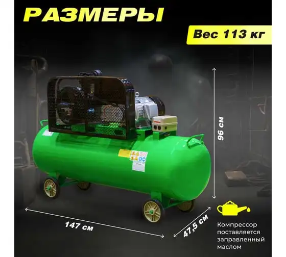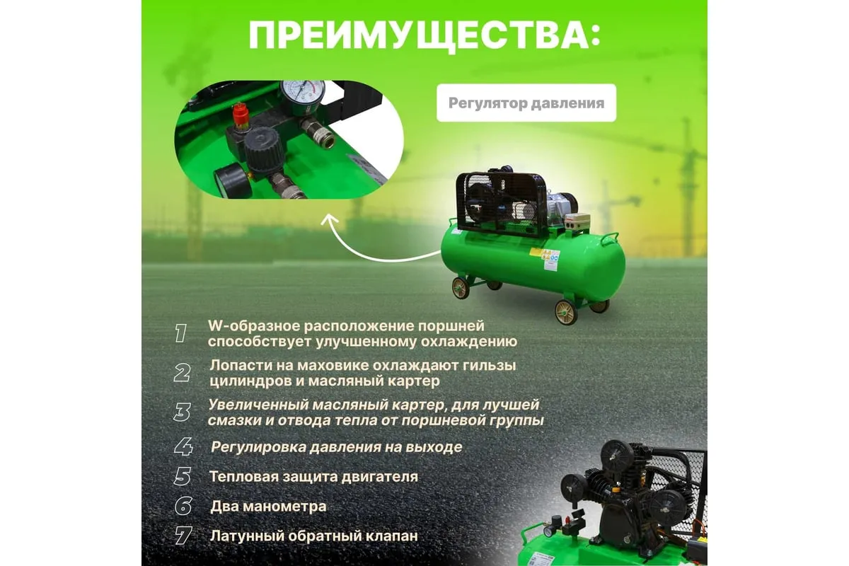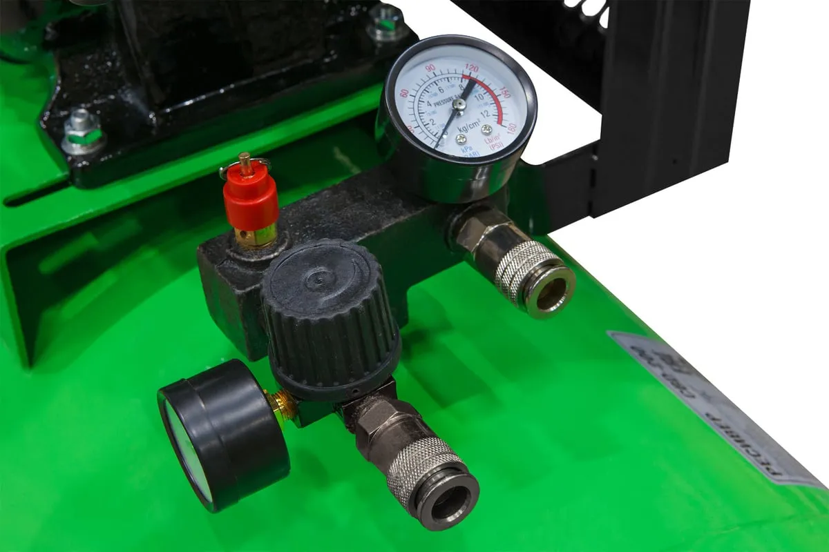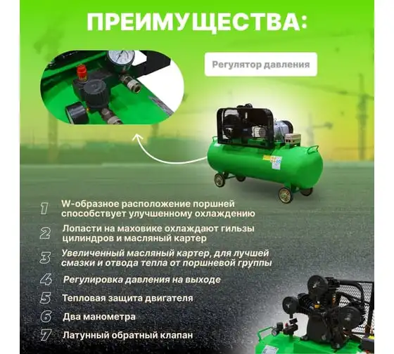 Мощная компрессорная головка обеспечивает высокую производительность при минимальном расходе энергии и создает оптимальную степень сжатия. Для хранения воздуха установлен ресивер - можно проводить быстрые работы без запуска двигателя.