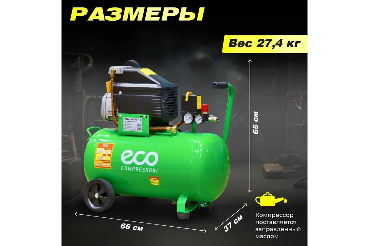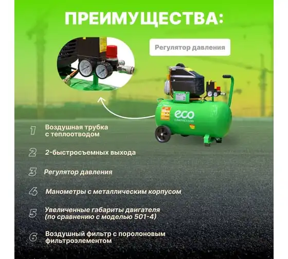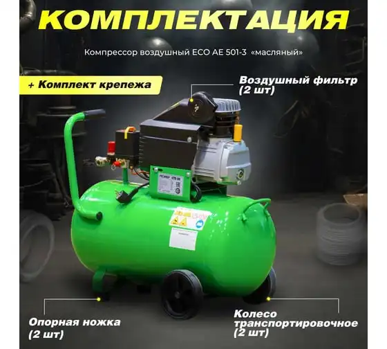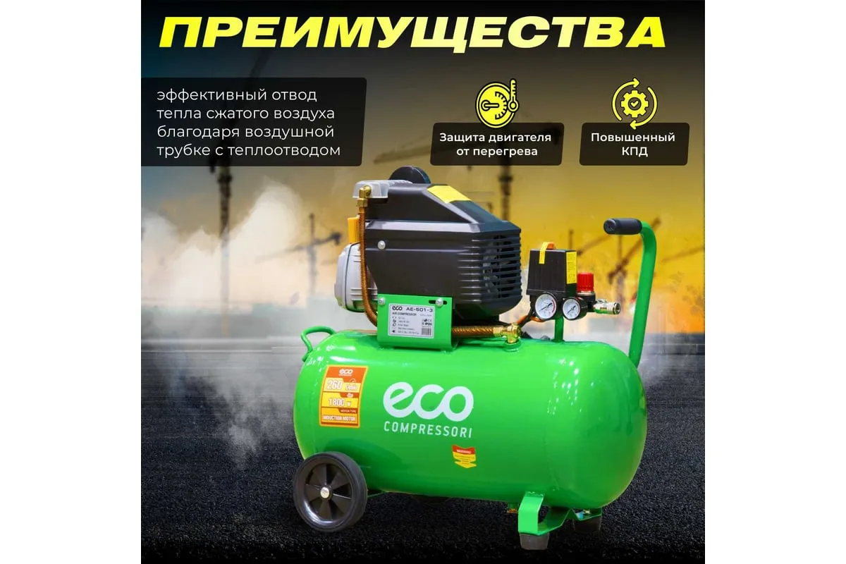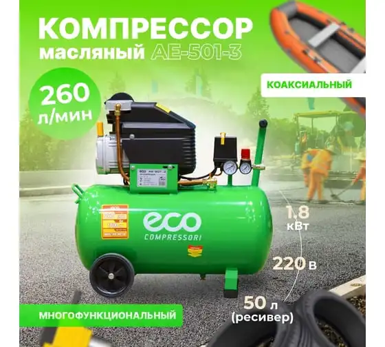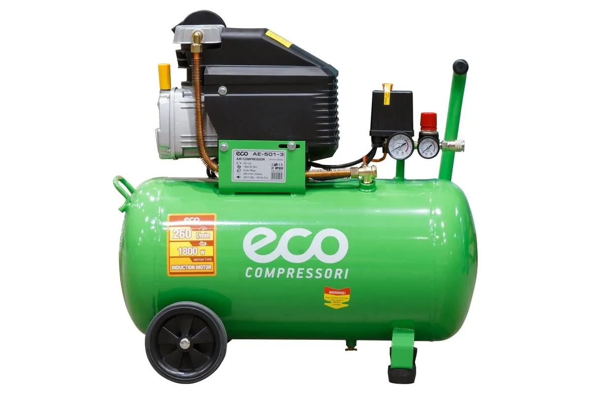 Компрессор ECO AE-501-3 предназначен для сжатия воздуха и подачи его в нужном направлении. Подходит для бытового использования в гараже или на даче.