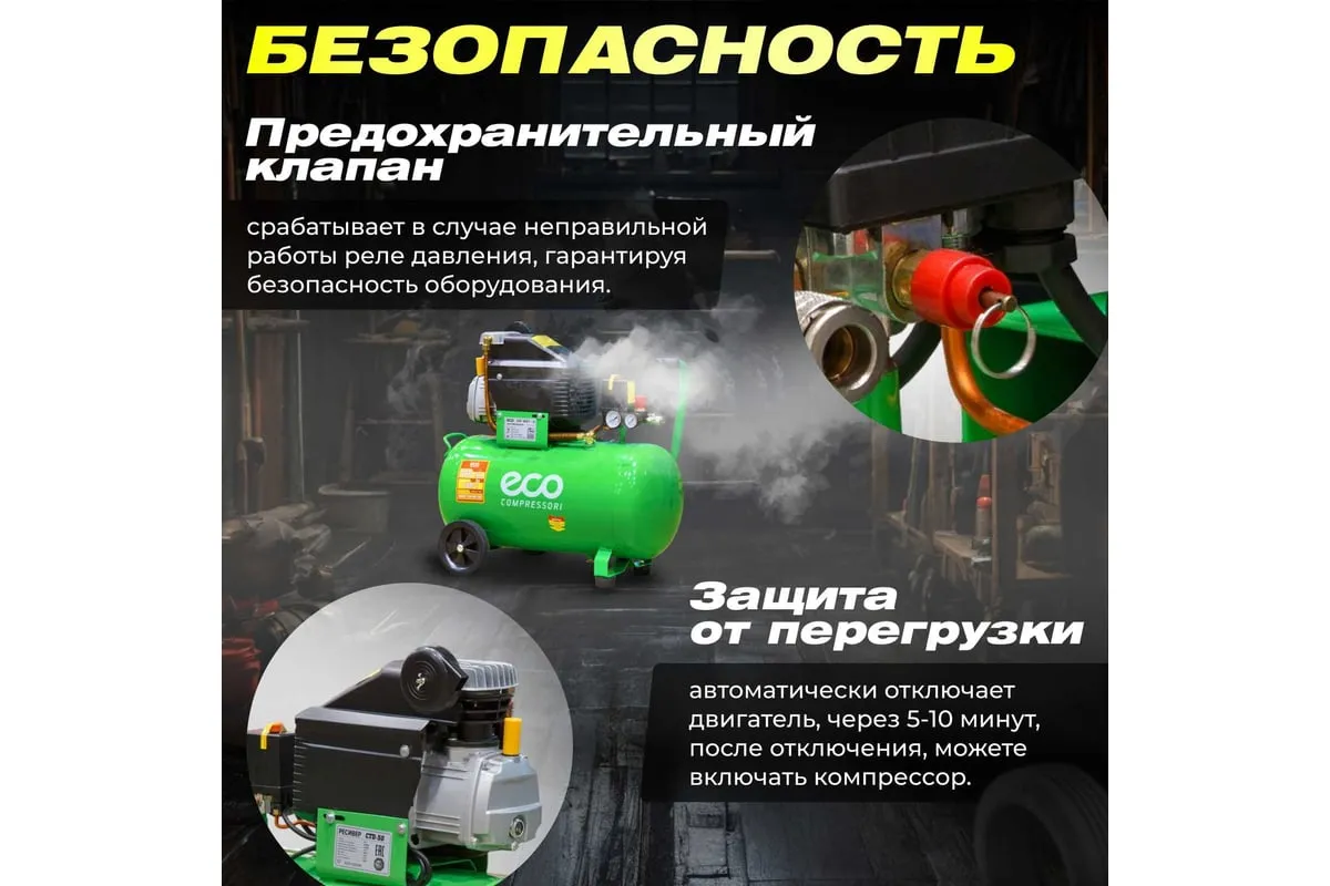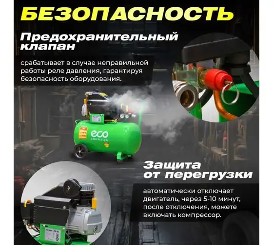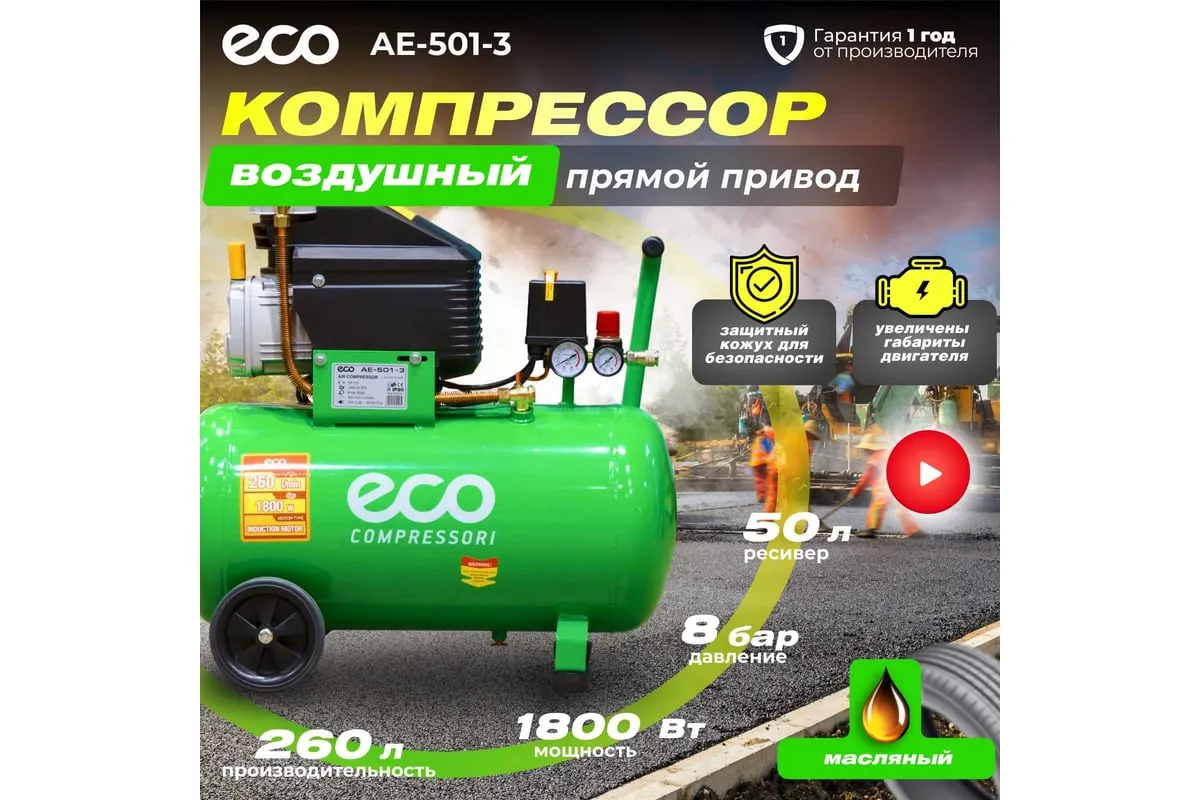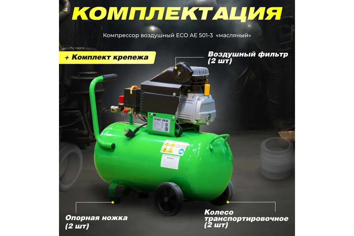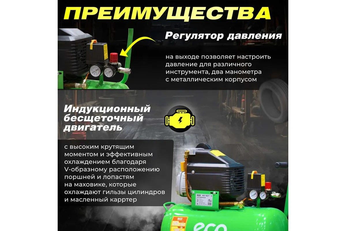 Компрессор ECO AE-501-3 предназначен для сжатия воздуха и подачи его в нужном направлении. Подходит для бытового использования в гараже или на даче.