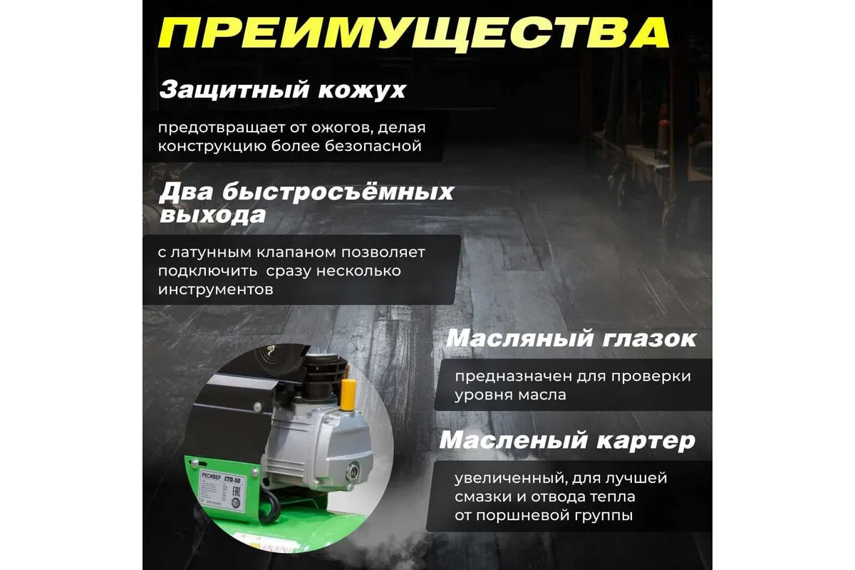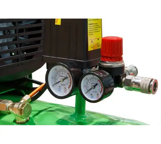 Наличие двух быстросъемных выходов позволяет подключить одновременно два инструмента. Регулятор давления обеспечивает безопасную работу.
