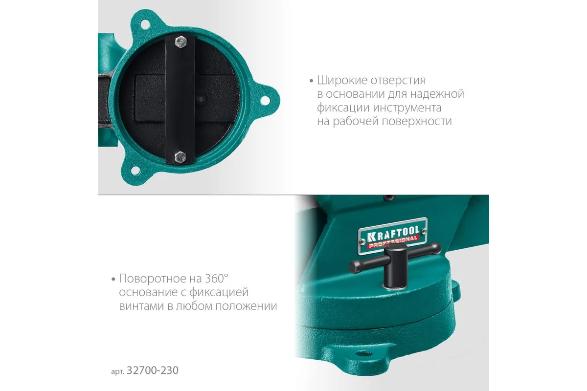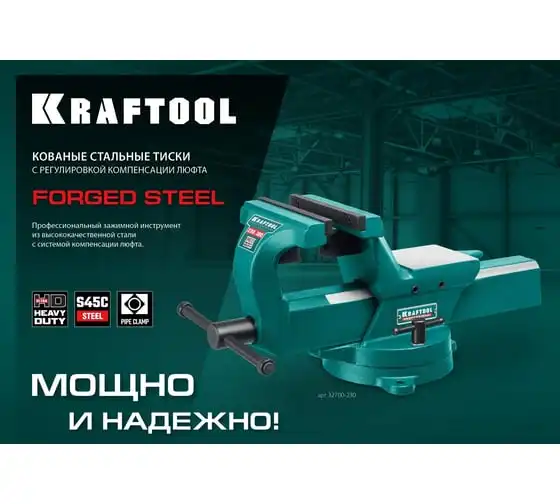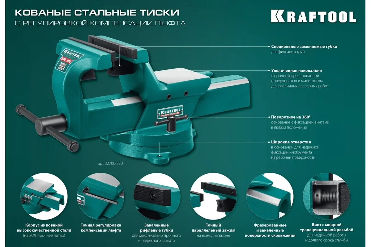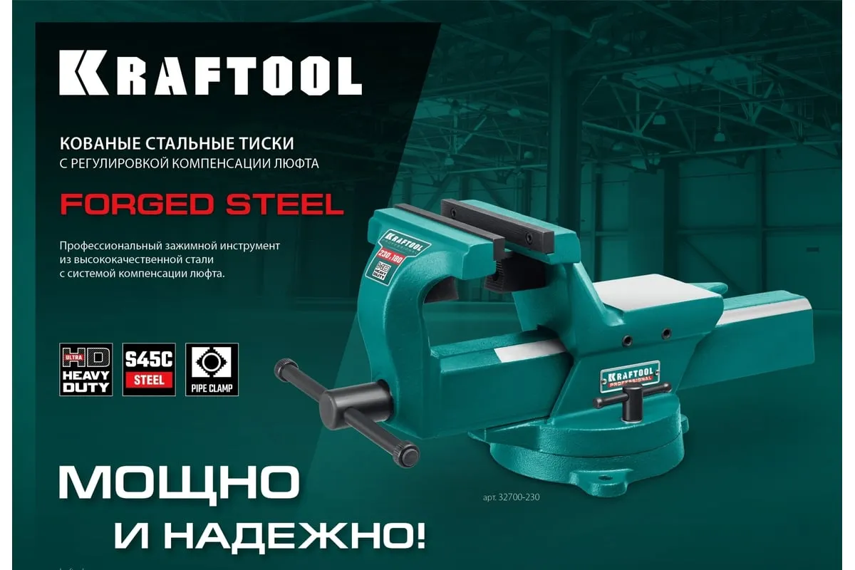Кованые стальные тиски KRAFTOOL Forge-180/230 32700-230 предназначены для фиксации и удержания деталей при выполнении столярных и слесарных работ. Поворотное основание и наличие наковальни расширяют сферу применения устройства.