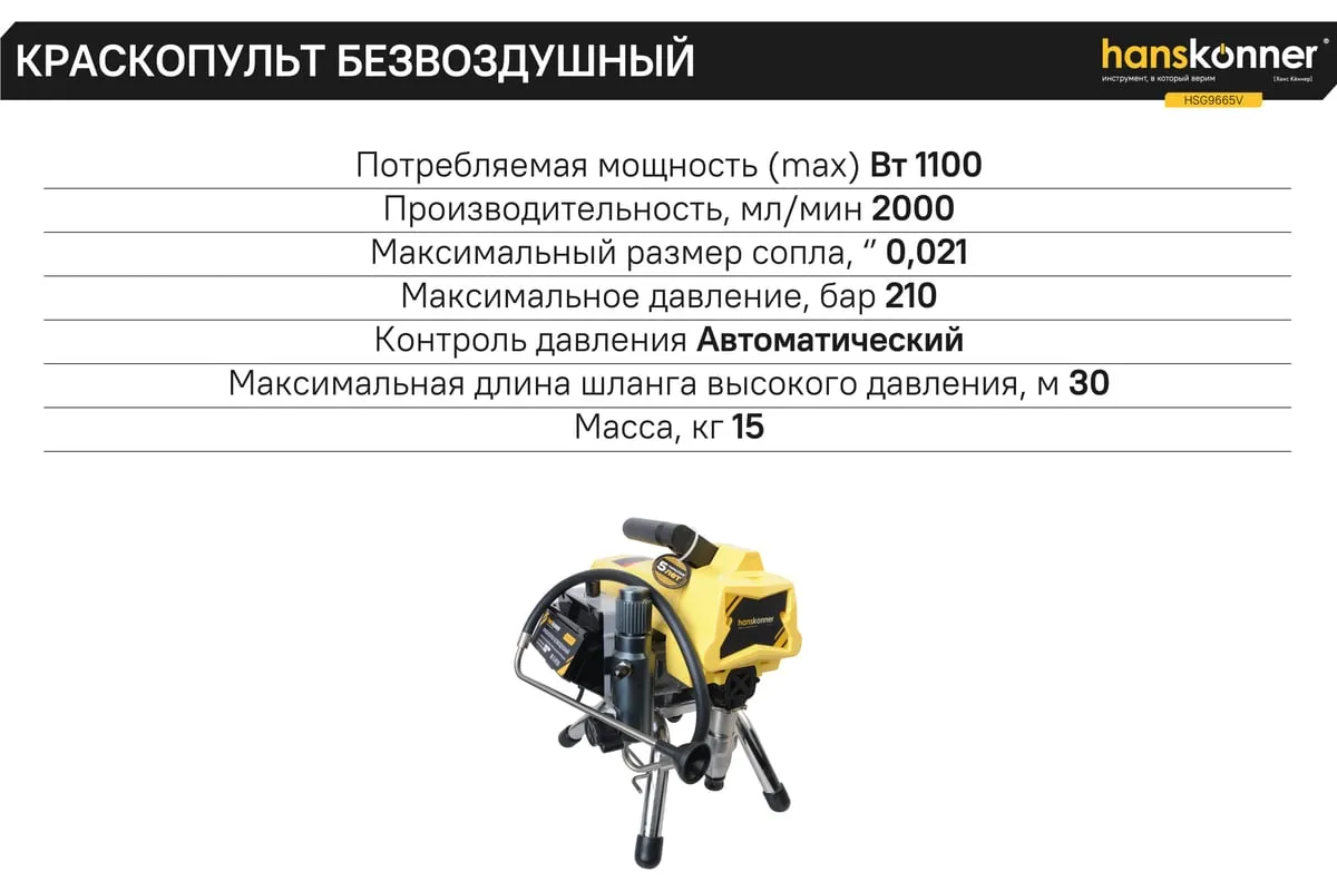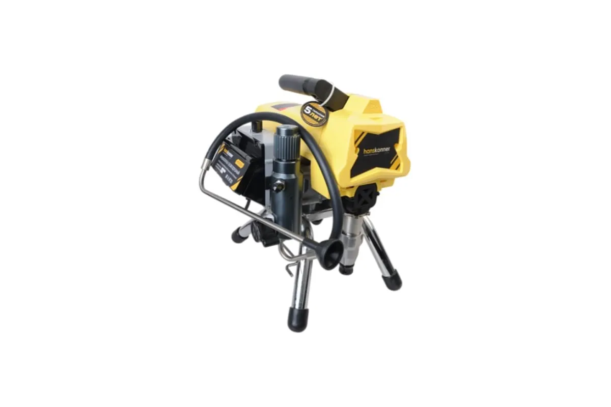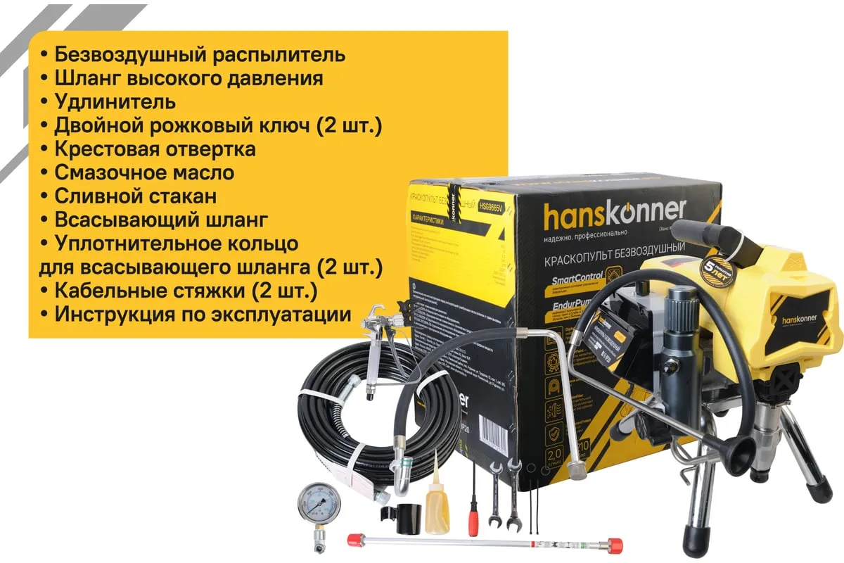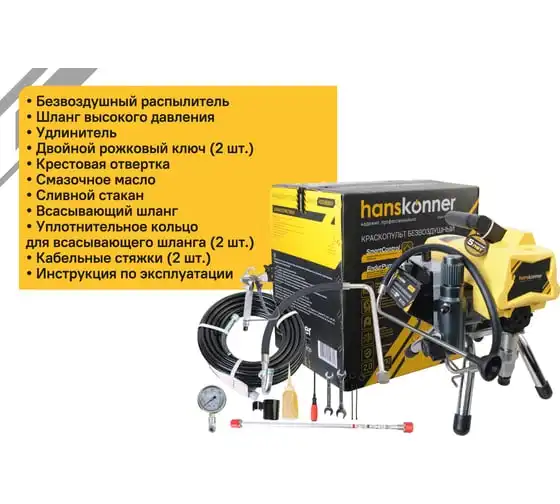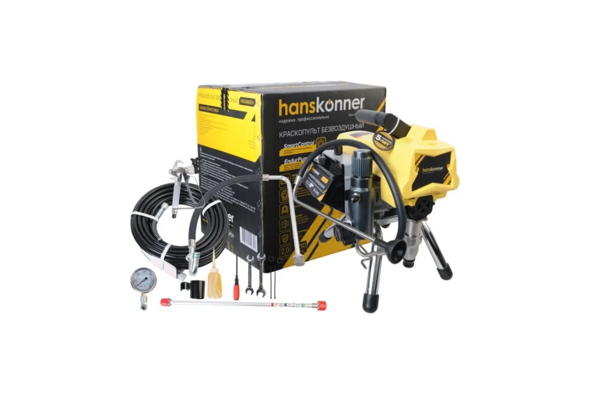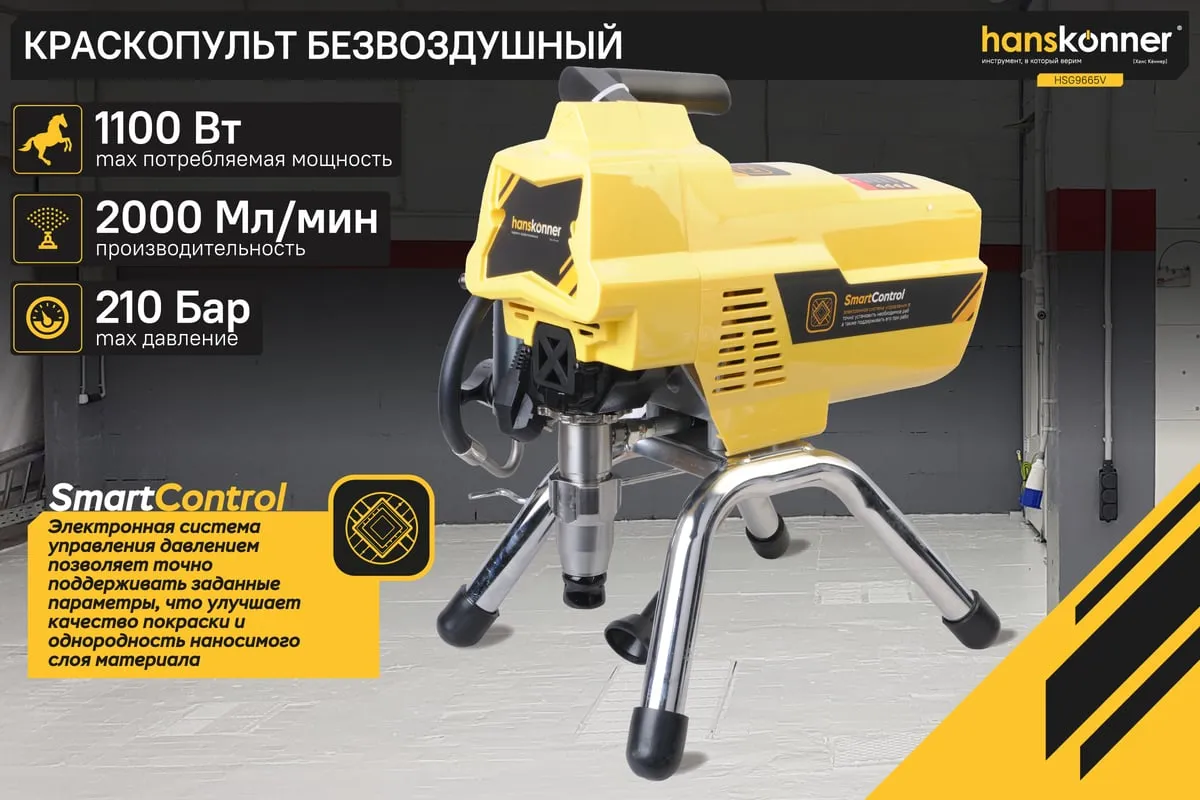 Краскопульт электрический безвоздушный HANSKONNER HSG9665V - надежный и продуктивный электроинструмент для нанесения лакокрасочных материалов без использования сжатого воздуха. Из-за большого перепада давления, от 210 Бар в насосе до атмосферного в пространстве, лакокрасочный материал дробиться на мельчайшие частицы и в виде аэрозольного факела оседает на окрашиваемой поверхности. Данная модель отличается электронной системой управления давлением SmartControl, что содействует качественному окрашиванию и дает возможность осуществлять интерьерную покраску. Для удобного регулирования продуктивности есть электронный дисплей. Дополнительный фильтр для очистки краски исключает частое засорение сопла.