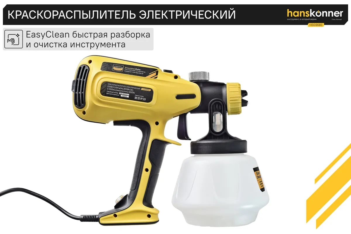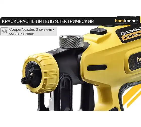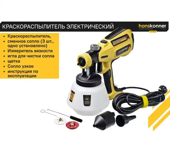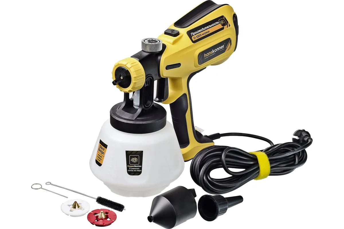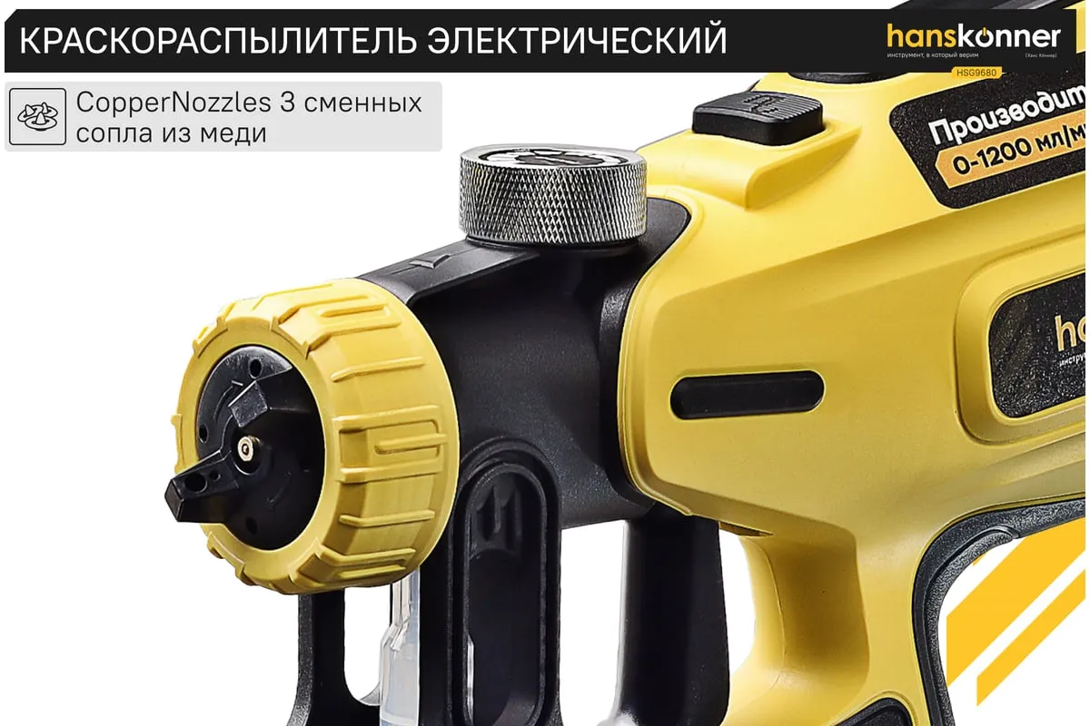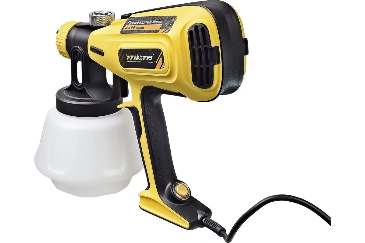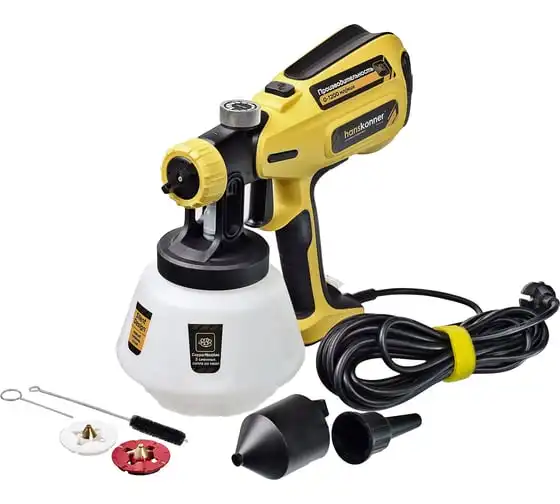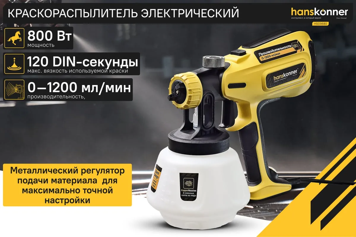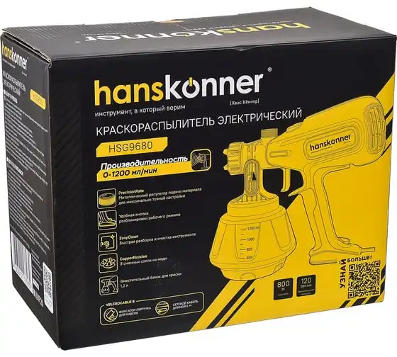 Hanskonner HSG9680 – универсальный электрический краскопульт. Отлично подходит для покраски фасадов зданий и ограждений, а также для проведения внутренних ремонтных работ. Позволяет эффективно работать в том числе и с наиболее вязкими материалами. Модель оснащена мощным 800 Вт электромотором и демонстрирует высокую, одну из лучших в классе, производительность в 1200 мл / мин.