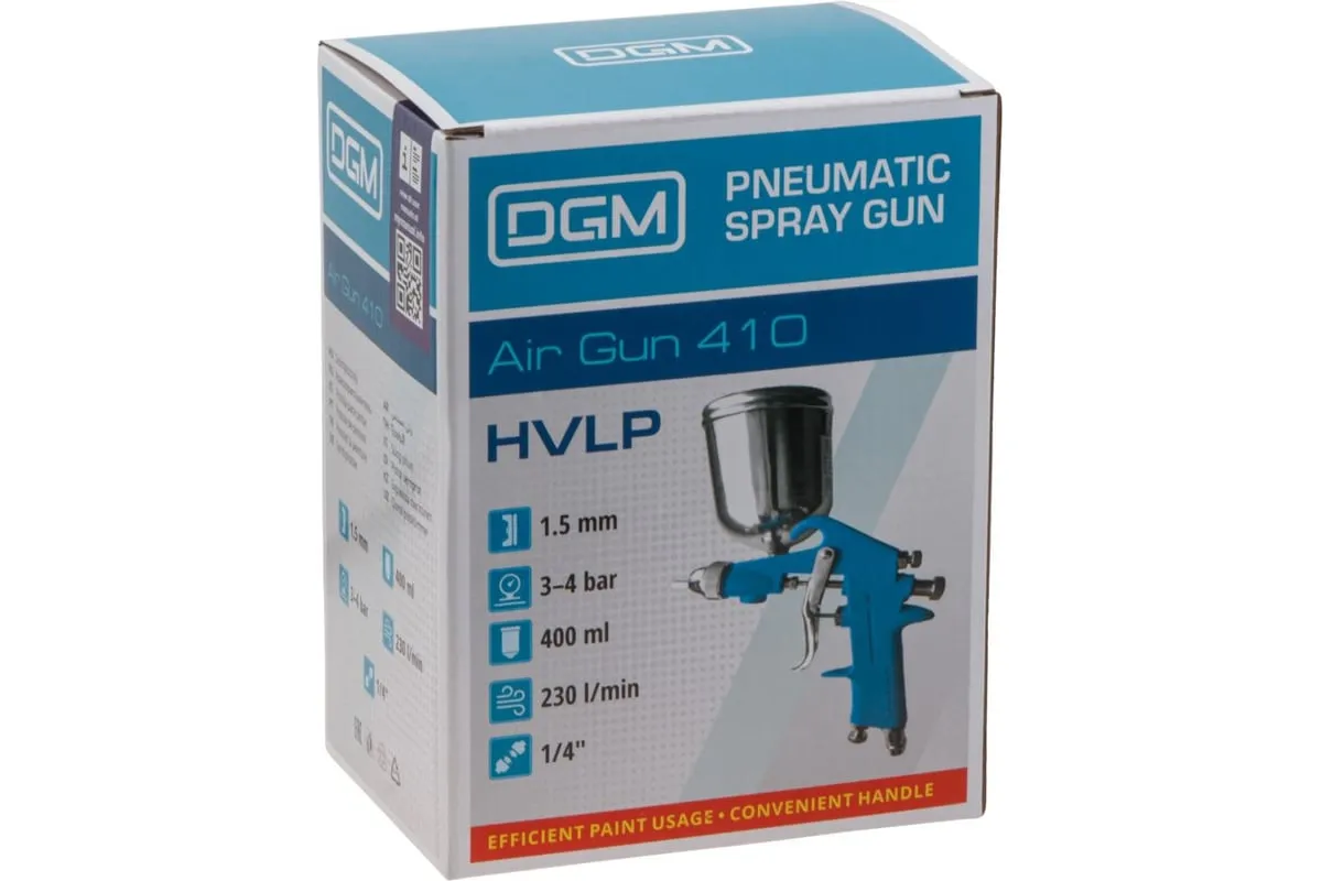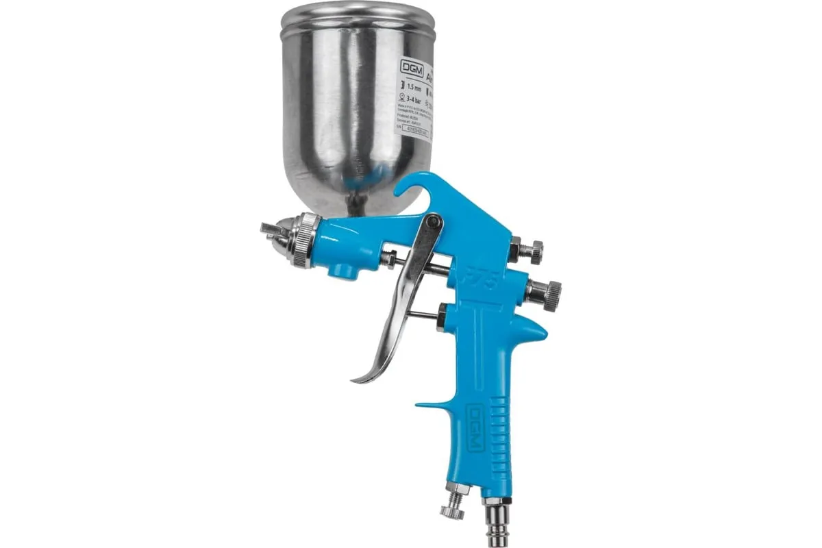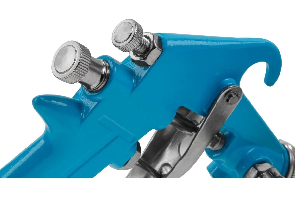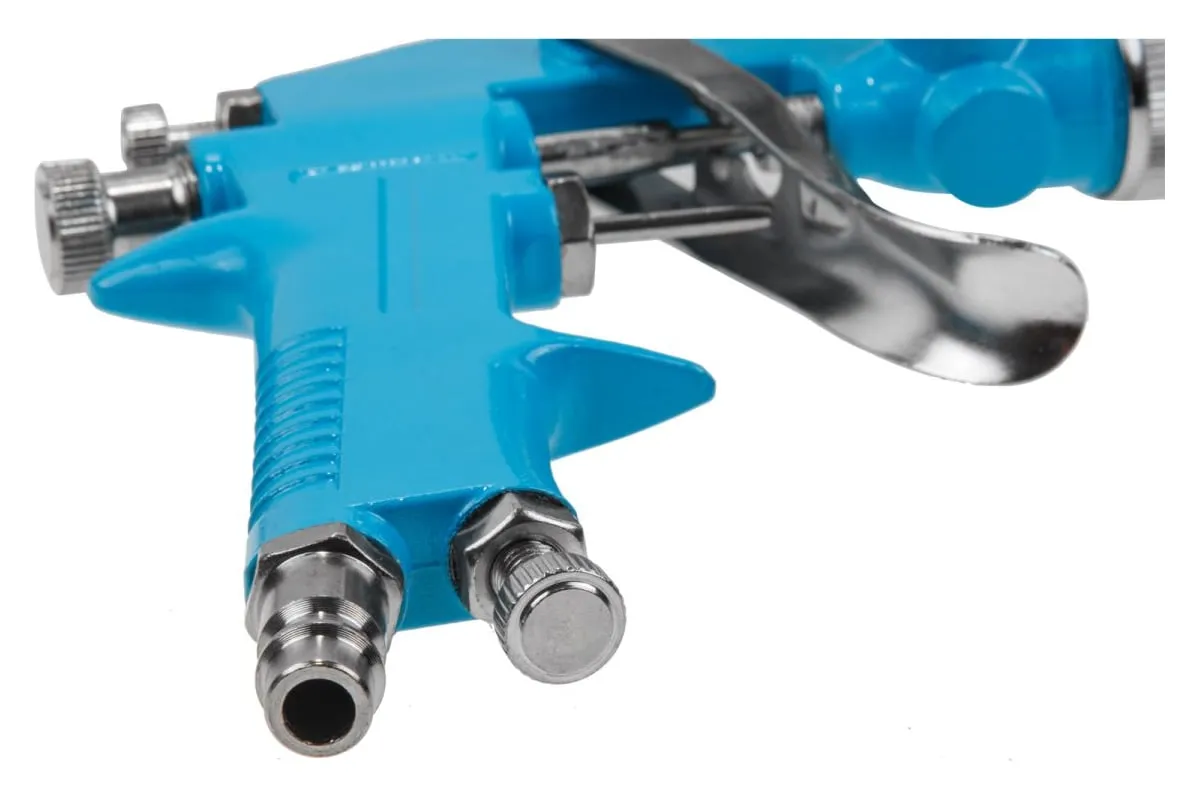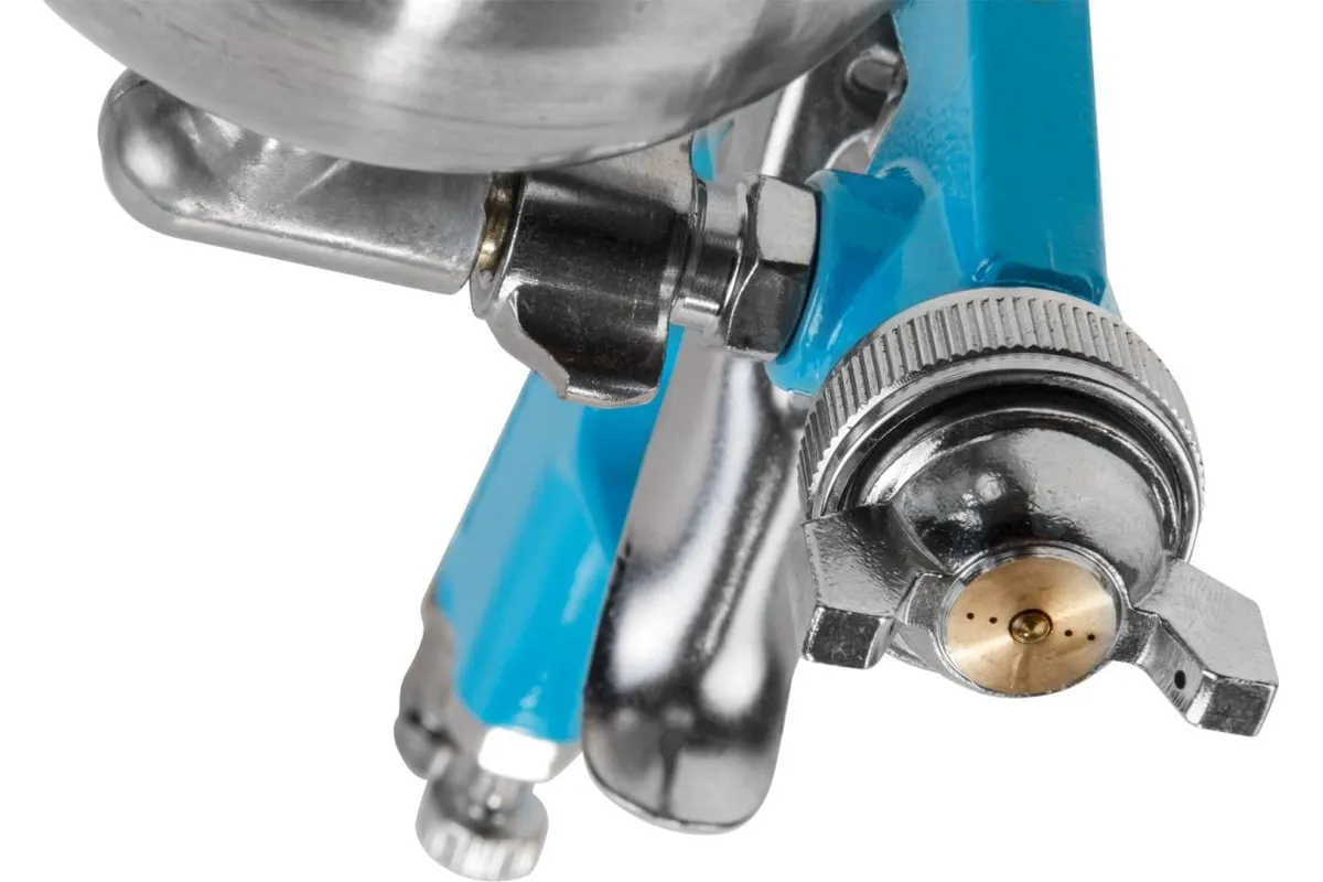Компактный краскораспылитель HVLP с поворотным металлическим бачком предназначен для труднодоступных мест, позволяя наносить материал на поверхности в разных плоскостях.