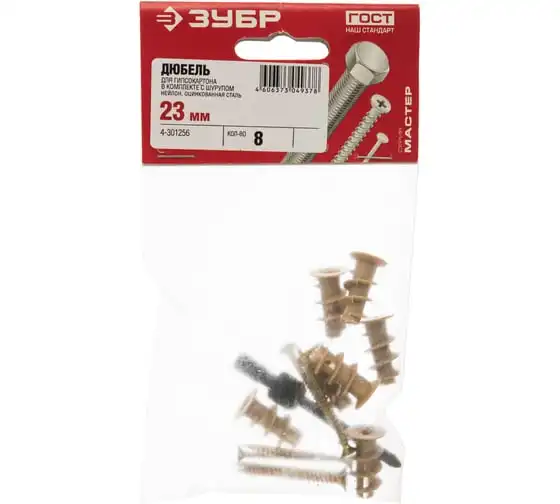 Дюбель для гипсокартона Зубр нейлоновый, с оцинкованным саморезом и установочн. инструментом, ТФ 6, 23мм, 8шт 4-301256