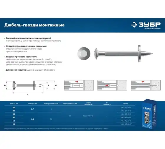 Монтажный дюбель-гвоздь ЗУБР Дгм 40x4.5 мм, цинк, 1 кг 3063-45-40-1