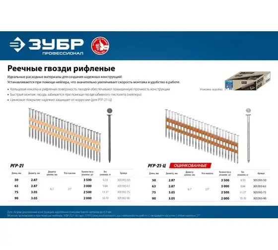 Реечные гвозди ЗУБР SN21 рифленые 80x3.1 мм, оцинкованные, 2000 шт 305396-80
