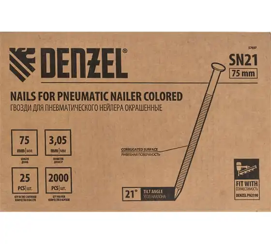 Гвозди для пневматического нейлера Denzel (крашен.), длина - 75 мм, диаметр - 3,05 мм, 2000 шт. 57697