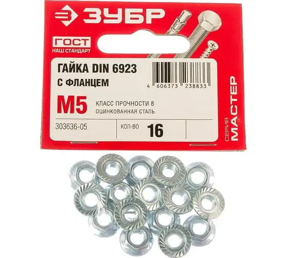 Гайка DIN 6923 с фланцем ЗУБР, M5, 16 шт, кл. пр. 8, оцинкованная, 303636-05