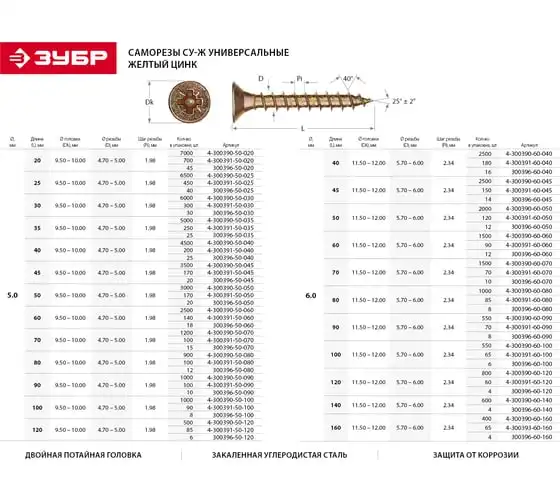 Универсальные саморезы СУ-Ж ЗУБР, 60 x 5.0 мм, 18 шт, желтый цинк, 300396-50-060