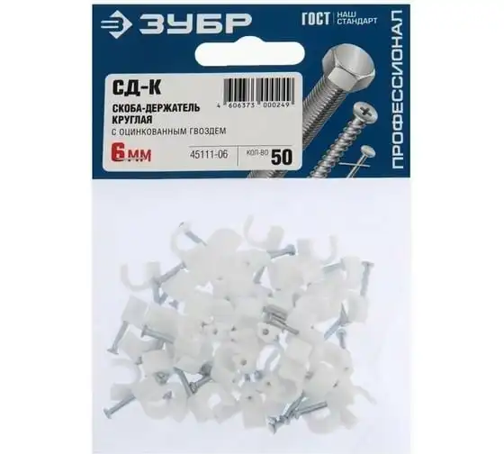 Круглая скоба с гвоздем Зубр для крепления кабеля 6мм, 50шт 45111-06