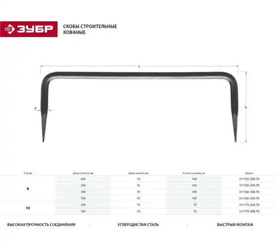 Строительная кованая скоба ЗУБР 300 х 70 х 8мм, 100 шт 311165-300-70