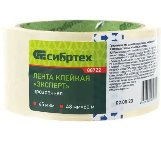 Клейкая лента СИБРТЕХ "Эксперт", 45 мкм, 48 мм х 60 м, цвет прозрачный 88722
