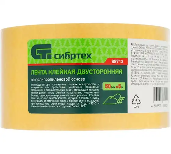 Клейкая двусторонняя лента на полипропиленовой основе СИБРТЕХ 50 мм х 5 м 88713
