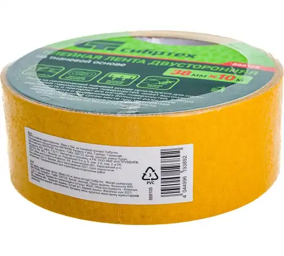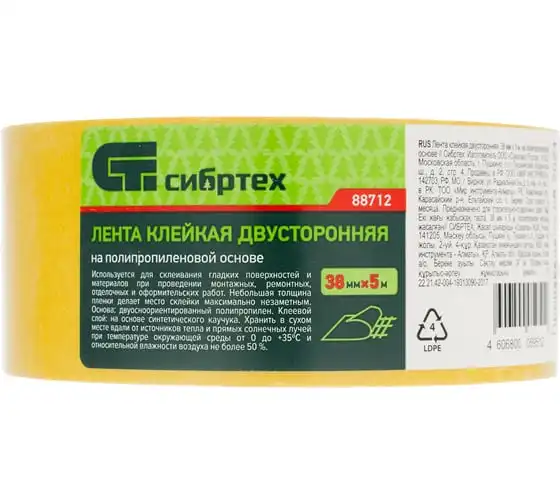 Клейкая двусторонняя лента СИБРТЕХ 38 мм х 5 м, на полипропиленовой основе 88712