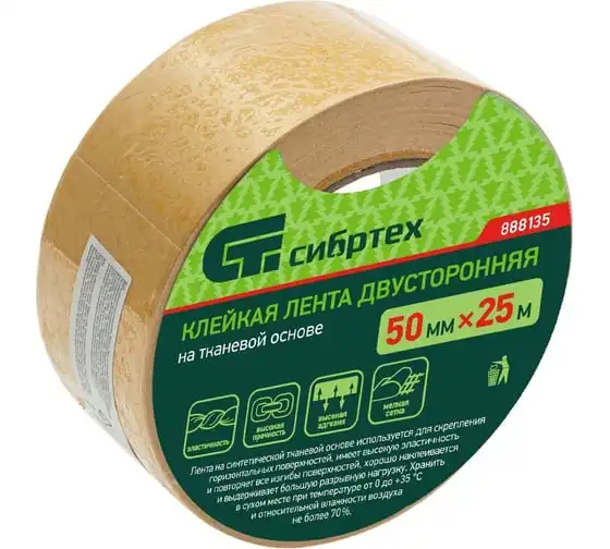 Двусторонняя клейкая лента на тканевой основе СИБРТЕХ 50 мм х 25 м 888135