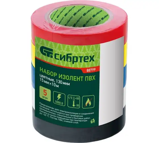 Набор изолент СИБРТЕХ ПВХ цветных 15мм х 10м, 5 шт.130 мкм 88799