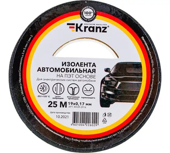 Автомобильная изолента KRANZ полиэстер, 0.17x19 мм, 25 м KR-09-2916