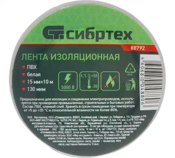 Изолента СИБРТЕХ ПВХ, 15 мм х 10 м, 130 мкм, белая 88792