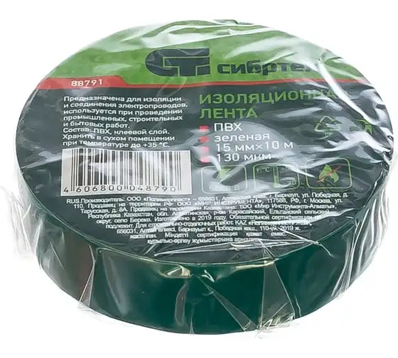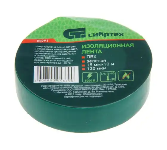 Изолента СИБРТЕХ ПВХ, 15 мм х 10 м, 130 мкм, зеленая 88791