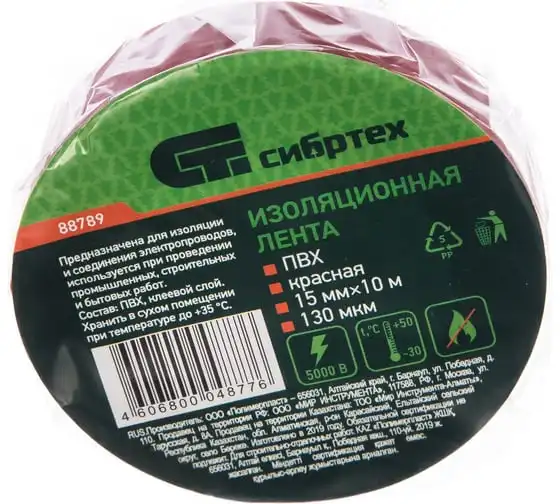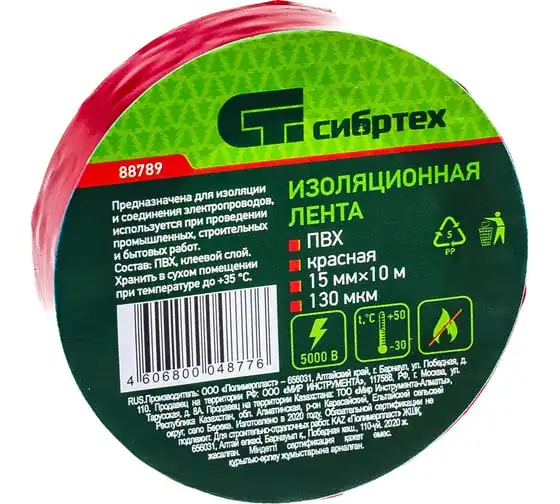 Изолента СИБРТЕХ ПВХ, 15 мм х 10 м, 130 мкм, красная 88789
