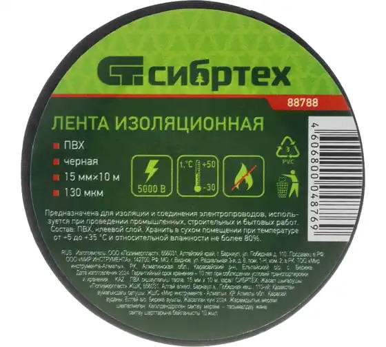 Изолента СИБРТЕХ ПВХ, 19 мм х 20 м, 130 мкм, черная 88794
