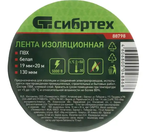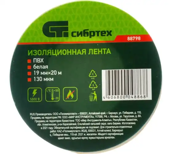 Изолента СИБРТЕХ ПВХ, 19 мм х 20 м, 130 мкм, белая 88798