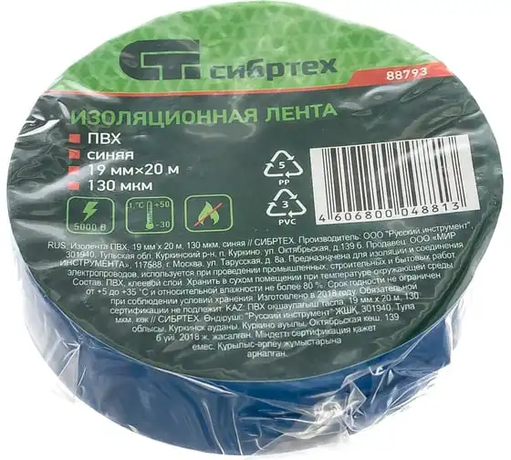 Изолента СИБРТЕХ ПВХ, 19 мм х 20 м, 130 мкм, синяя 88793