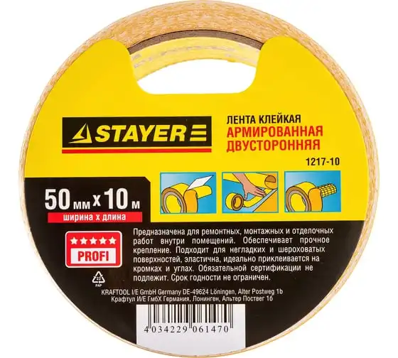 Лента клеящая двухсторонняя "PROFI" (50 мм; 10 м) укрепленная тканью Stayer 1217-10