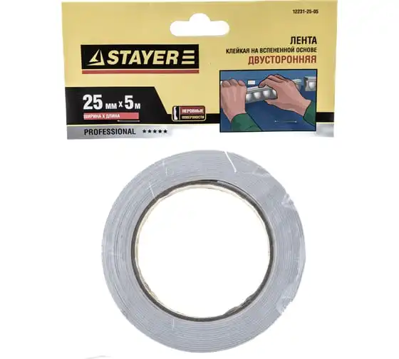Лента PROFI клейкая двусторонняя, на вспененной основе (5 м; 25 мм; белая) STAYER 12231-25-05
