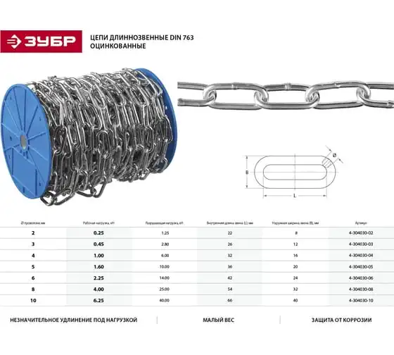 Длиннозвенная цепь Зубр DIN 763, оцинкованная сталь, d=8мм, L=18м 4-304030-08
