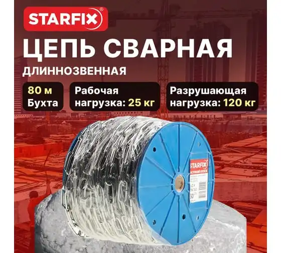 Сварная длиннозвенная оцинкованная цепь STARFIX LLC М2 DIN 763 бухта 80 м SMP-42314-80