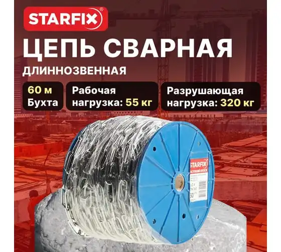 Сварная цепь STARFIX длиннозвенная, оцинкованная, LLC, М3, DIN 763, бухта 60 м SMP-42315-60