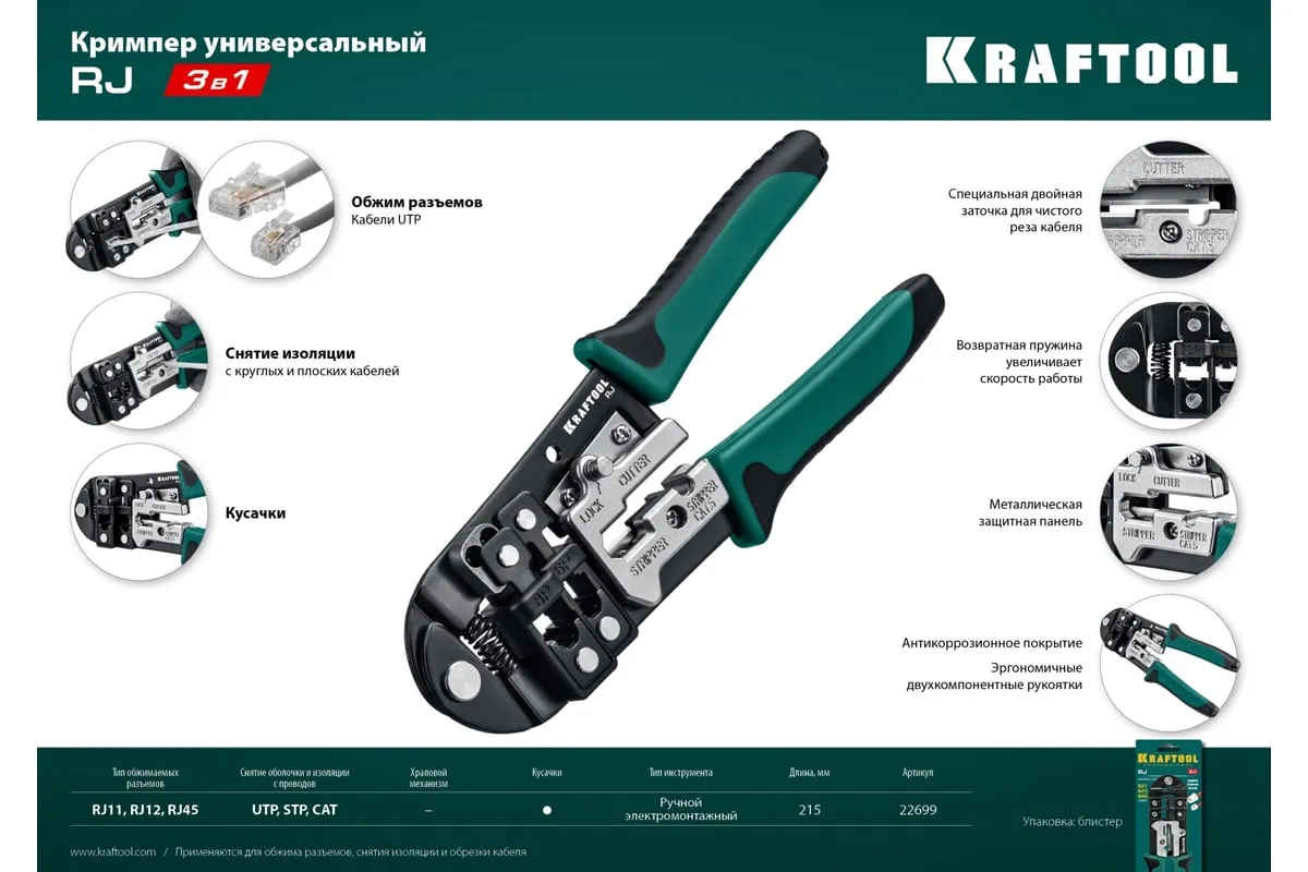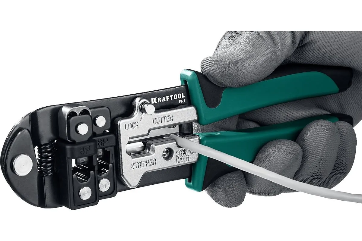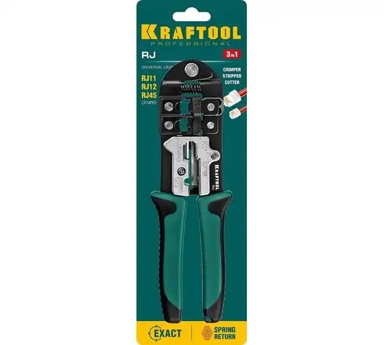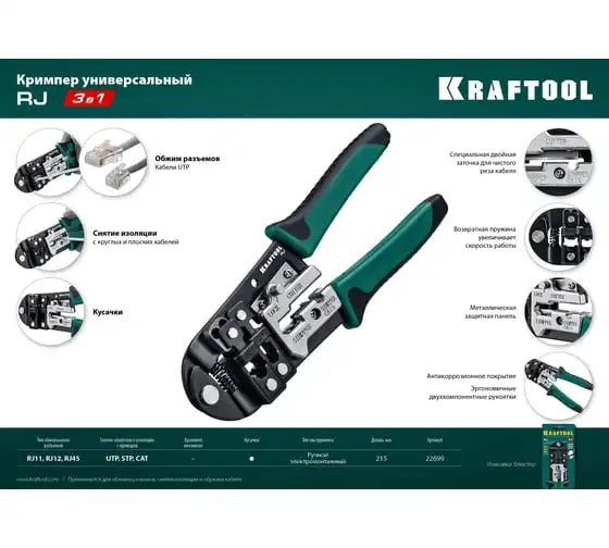 Кримпер универсальный KRAFTOOL 22699, предназначен для опрессовки изолированных и неизолированных кабельных наконечников и штекеров. Изготовлен из высококачественной инструментальной стали с закалкой рабочих поверхностей. Обладает повышенным ресурсом, обеспечивает наивысшее качество электромонтажных работ. Rj11/rj12 обжим разъемов на 6 контактов, а также Rj45 обжим разъемов на 8 контактов. Имеется съемник изоляции плоских и круглых кабелей. Губки инструмента выполнены из У8А стали.