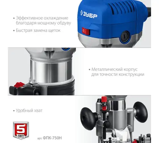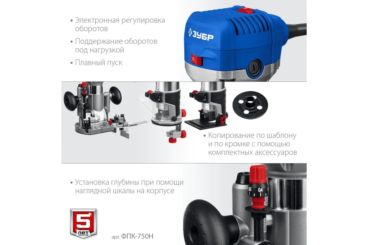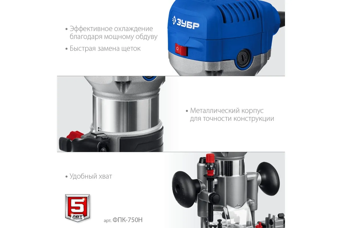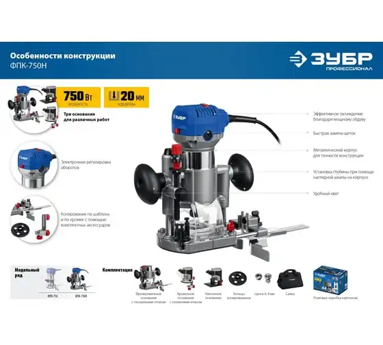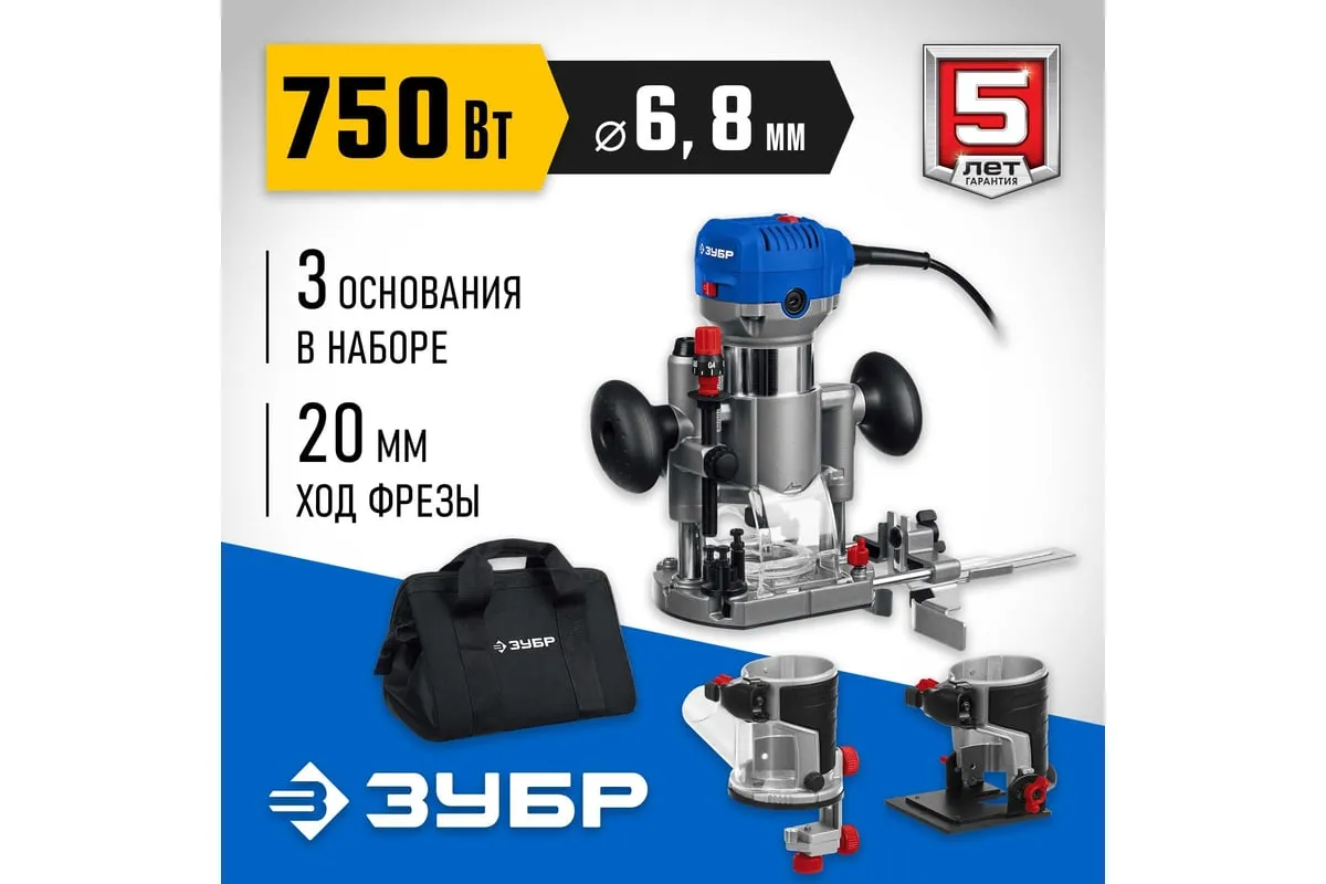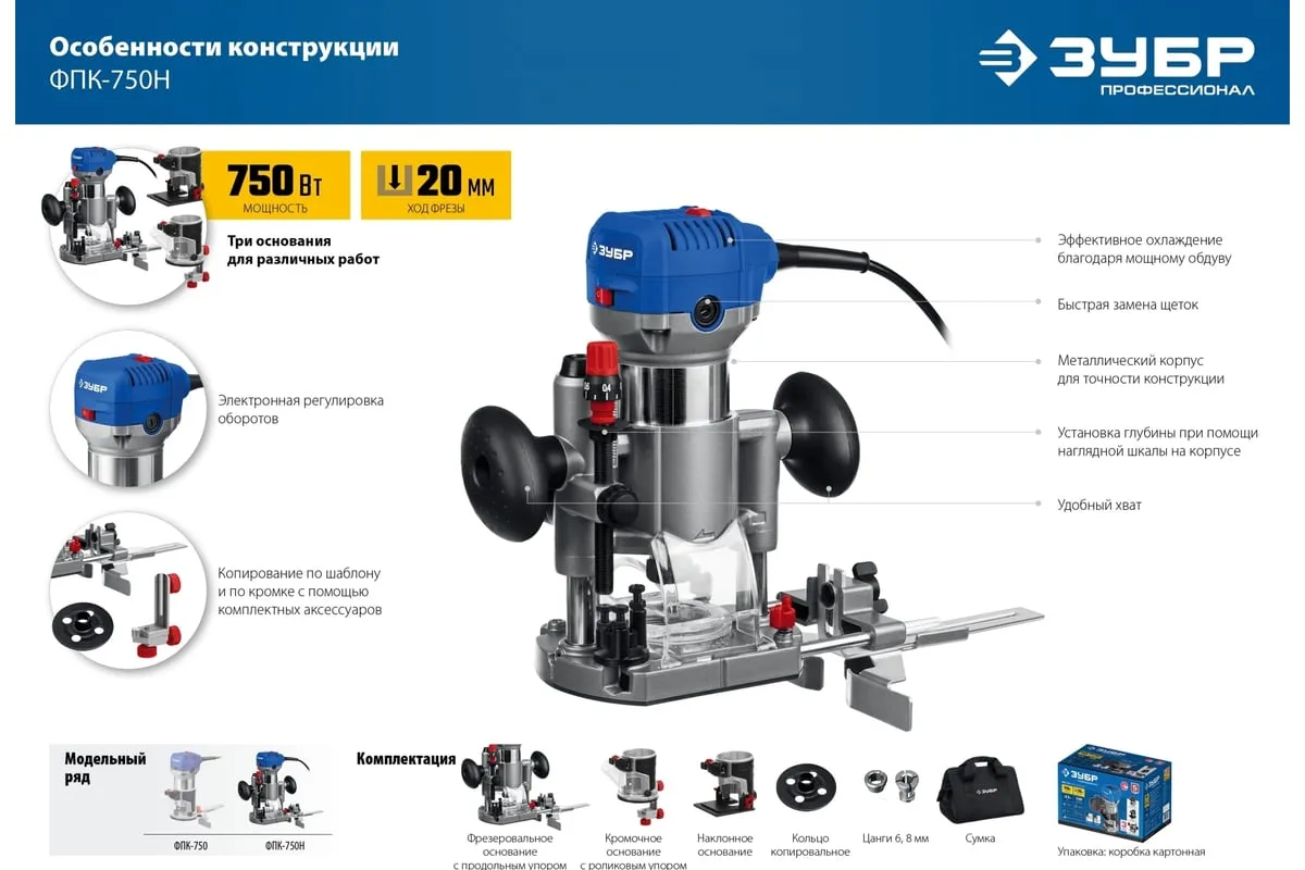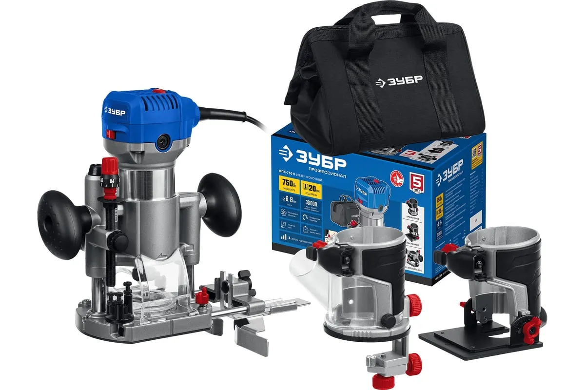 Фрезер кромочный 750 вт, в наборе - 3 основания, сумка, ЗУБР Профессионал ФПК-750Н применяется для фрезерования (в т.ч. фигурного, по шаблону, по радиусу) заготовок из дерева, древесно-стружечных плит, пластмасс и металла (при установке соответствующих фрез).
