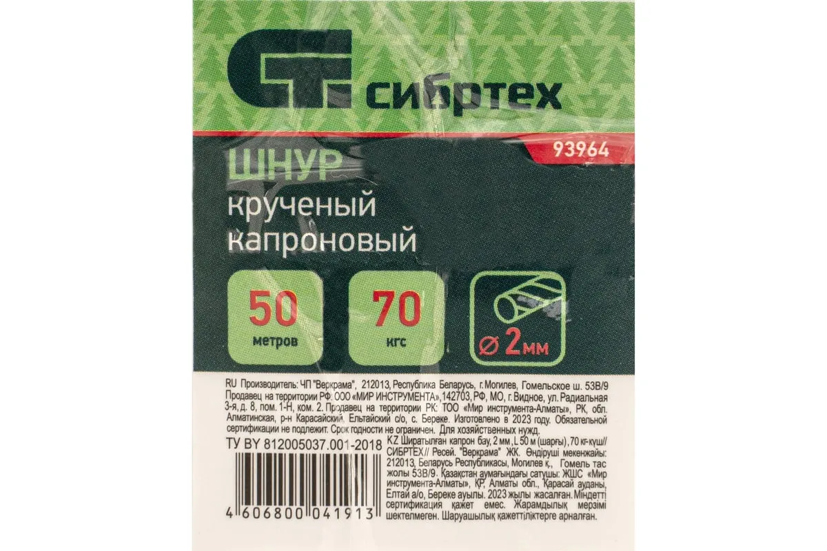 Крученый капроновый шнур Сибртех 93964 диаметром 2 мм, длиной 50 м, на катушке, пригодится на строительной площадке, в походе, на охоте или рыбалке. Также будет полезен дома или на даче для упаковки и связывания предметов, сушки белья или подвязки растений. Легкий и прочный, выдерживает разрывную нагрузку до 70 кгс. Шнур на катушке не запутывается во время хранения и транспортировки.