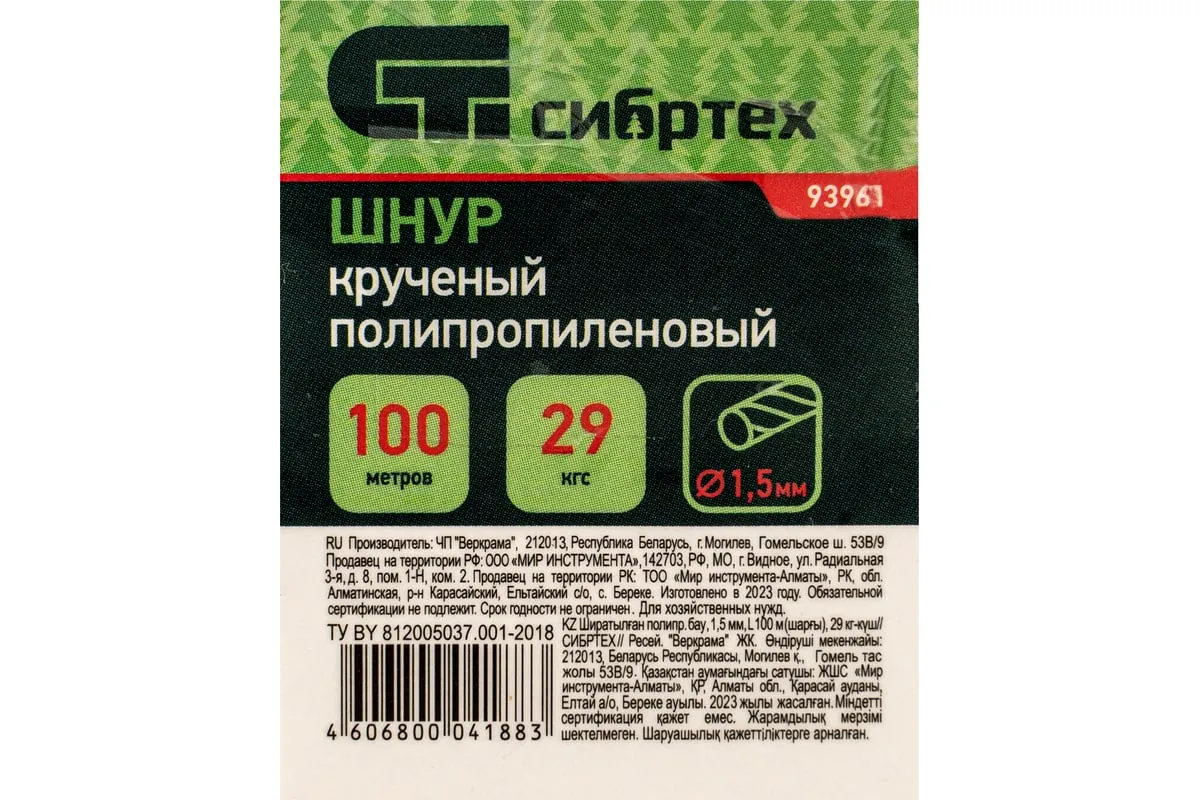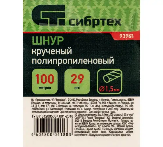 Крученый полипропиленовый шнур Сибртех 93961 на катушке, диаметром 1,5 мм, длиной 100 м, используется в профессиональных и бытовых целях — для разметки поверхностей, связывания и упаковывания предметов, подвязки растений. Узлы завязываются легко благодаря мягкости и эластичности шнура. Он будет полезен дома, на даче, в походе, на охоте или рыбалке.