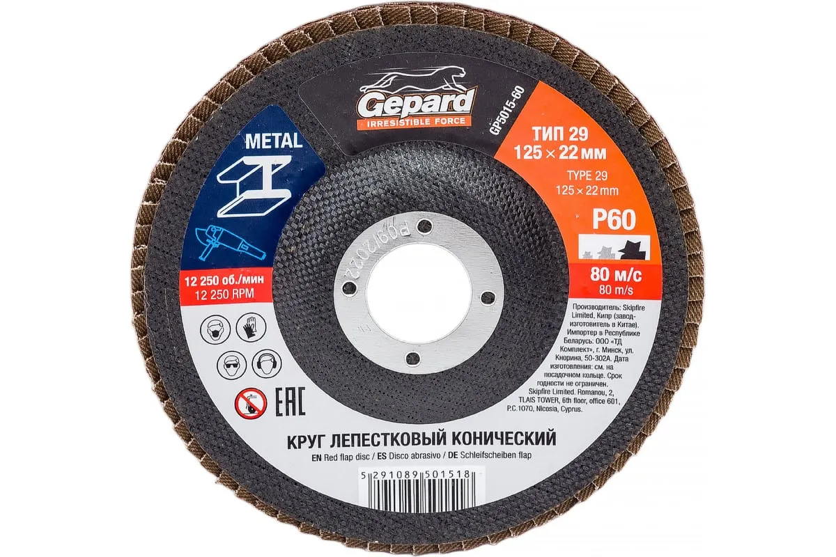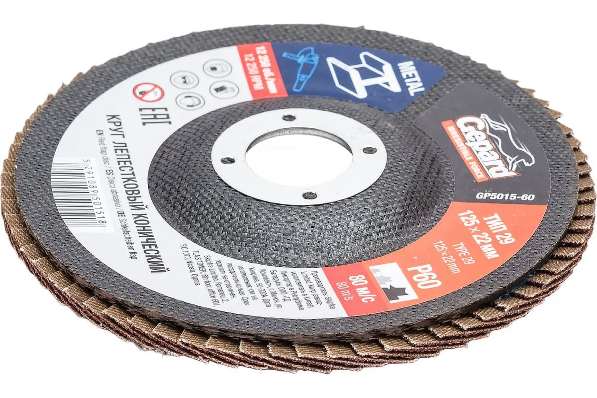 Круг лепестковый конический 125х22 мм, P60 Gepard GP5015-60 служит для работы совместно с УШМ соответствующего типоразмера. Предназначен для шлифовальных работ по металлу, инструментальной стали, чугуну, дереву и пластику. Состоит из корунда (оксид алюминия), тканевой основы, обода из инструментальной стали. Угол наклона 10 градусов. Рекомендован для обработки криволинейных и изогнутых поверхностей. Внимание, изображение товара может отличаться от реального! Верные параметры указаны в технических характеристиках товара.