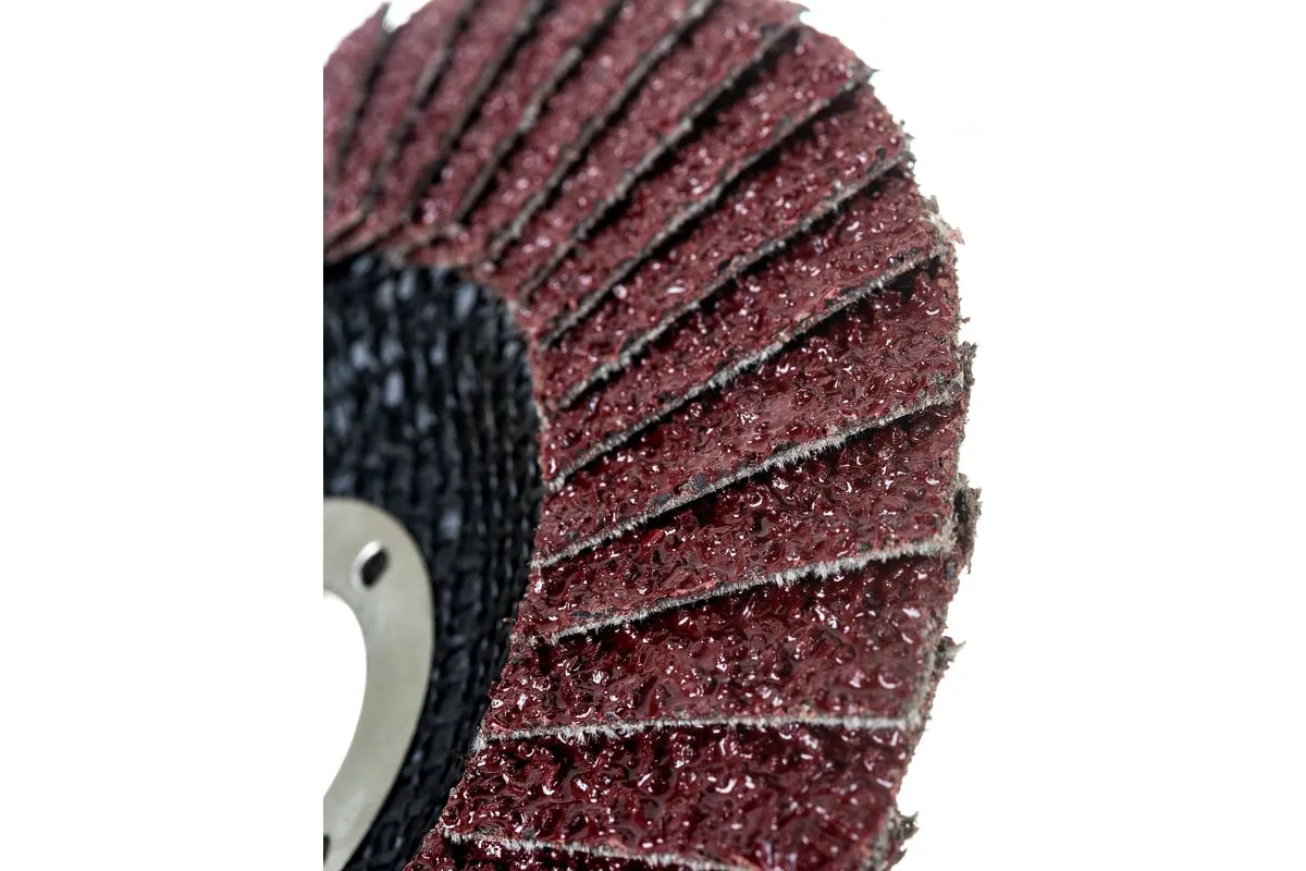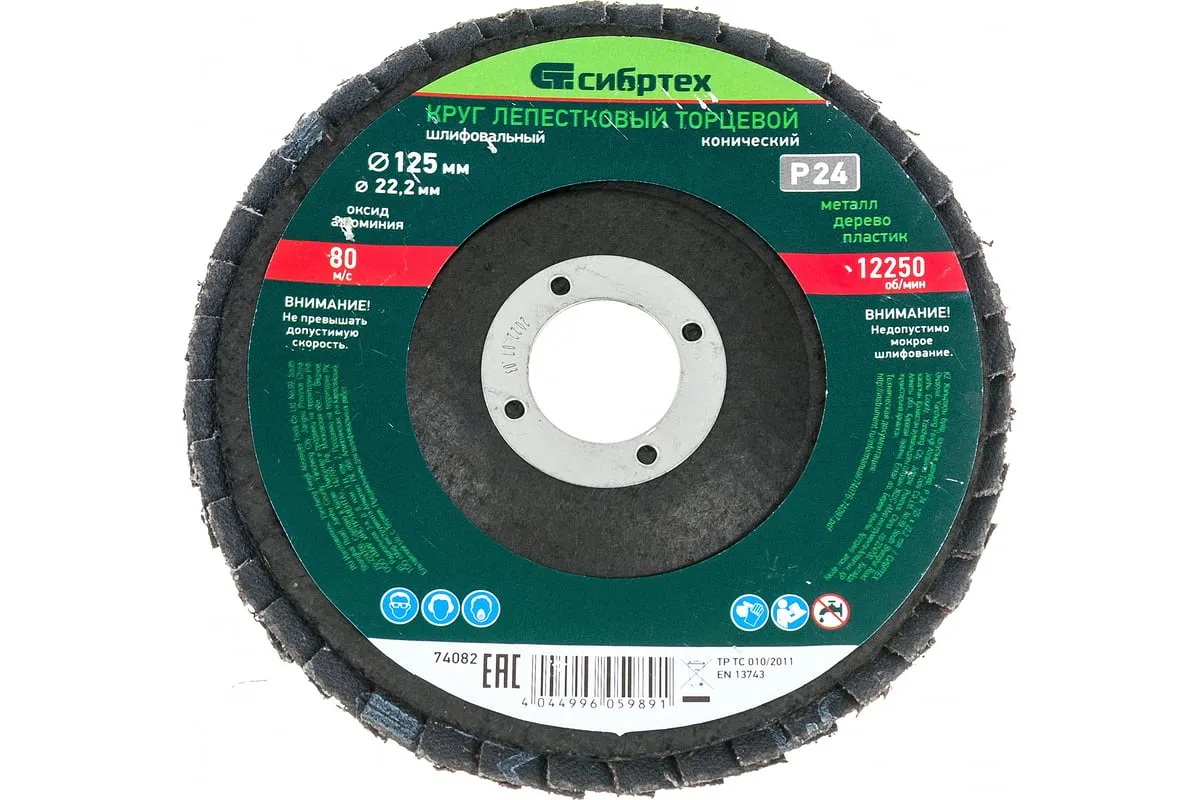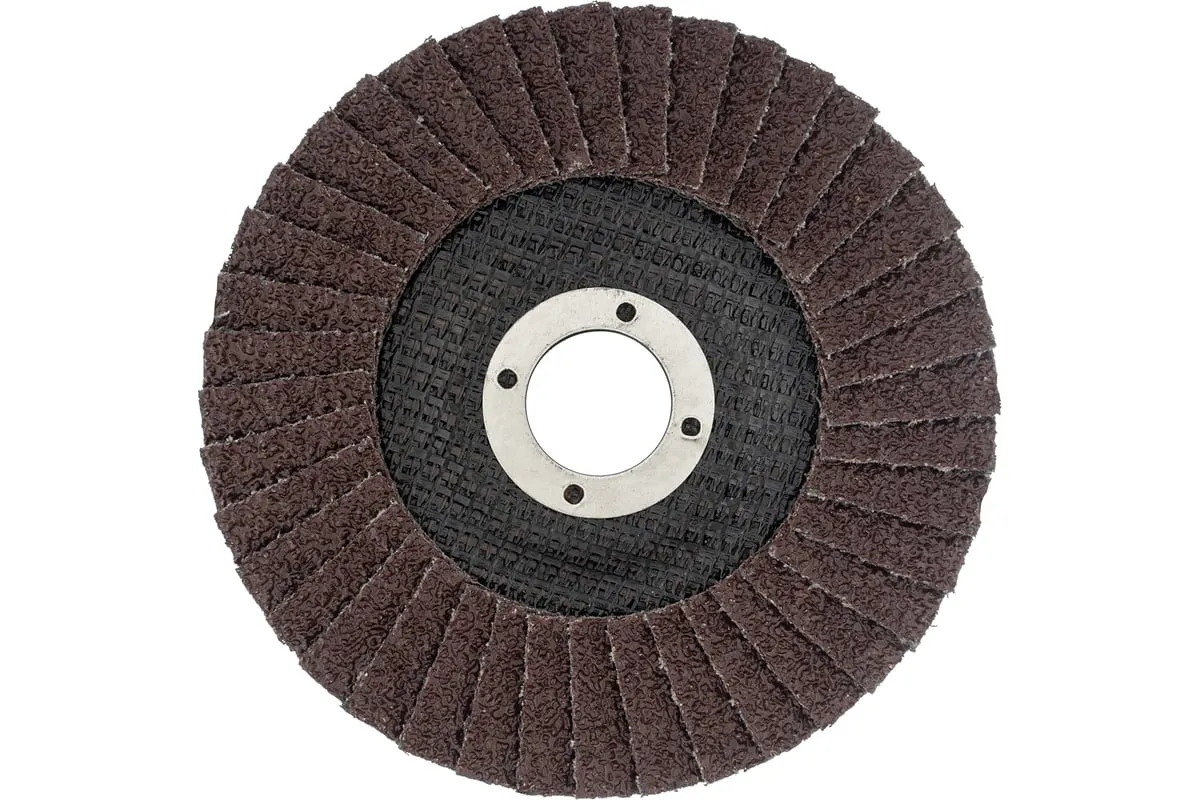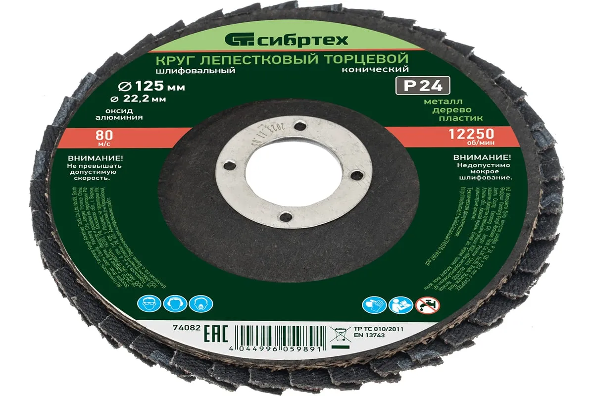 Круг лепестковый торцевой конический Сибртех 74082 с крупнозернистым абразивом Р24, 125 х 22,2 мм, устанавливается на углошлифовальные машины с соответствующим посадочным диаметром. Он используется для грубой (черновой) обработки, торцевого и плоского шлифования древесины, металла, пластика. С помощью него можно выполнить первичную зачистку сварных швов, убрать грубые дефекты, толстый слой ржавчины и краски и т.д.