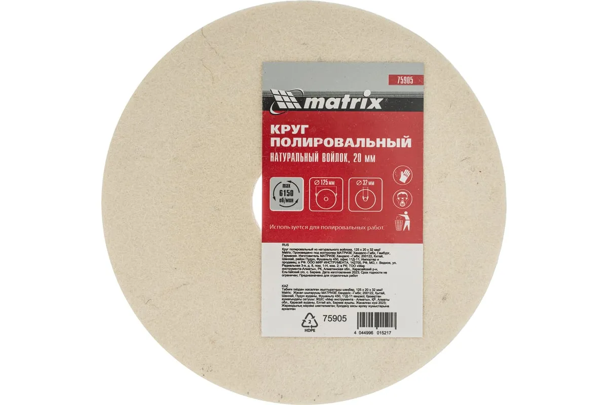 Круг полировальный из натурального войлока Matrix 75905, 125 х 20 х 32 мм, используется для обработки изделий из цветных металлов и стали, в том числе нержавеющей, пластика, стекла и др. Он устраняет риски и царапины, оставшиеся после шлифовки, а также позволяет придать поверхности блеск. Круг устанавливается на точильный станок с посадочным отверстием 32 мм и подходит для бытового и профессионального применения.