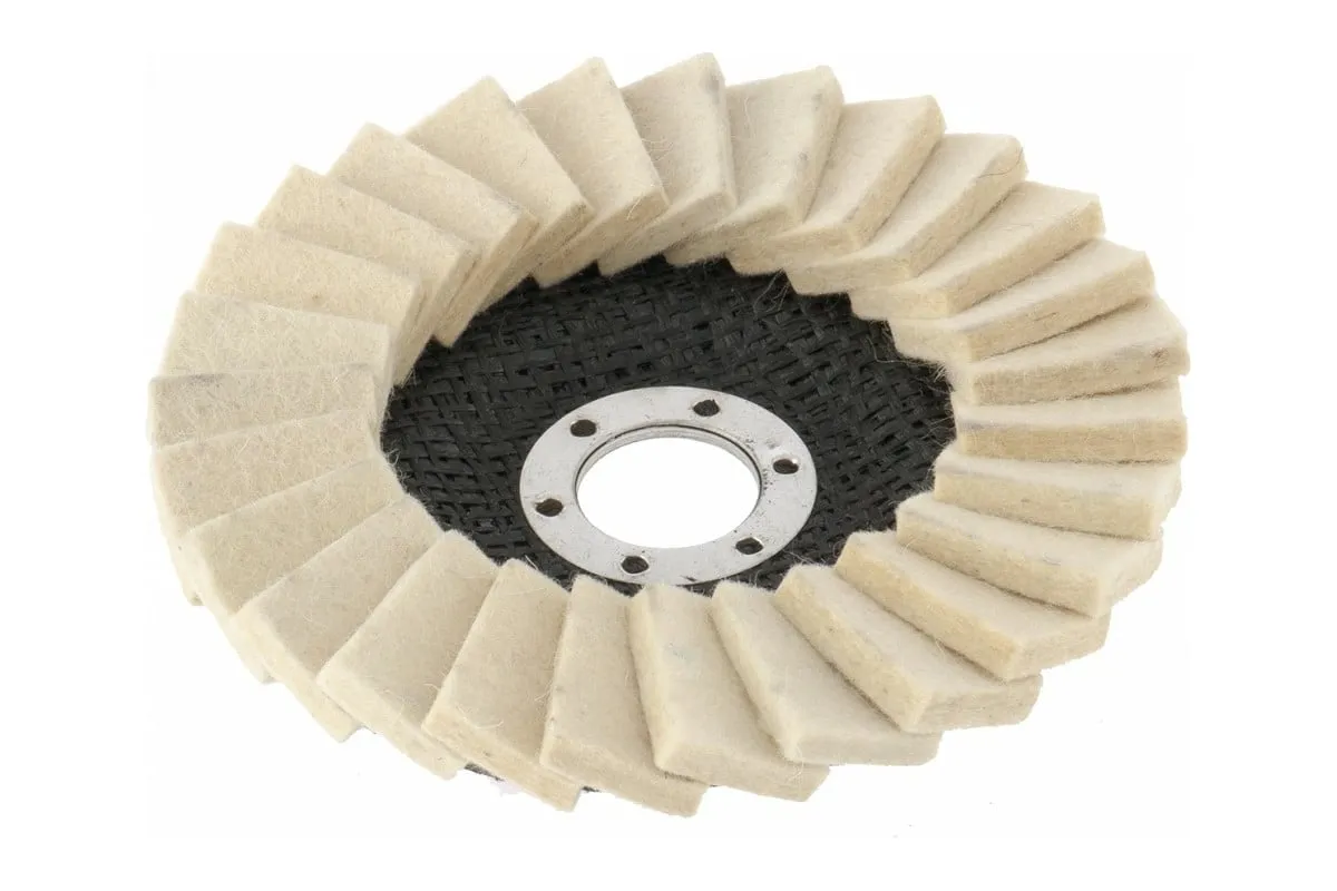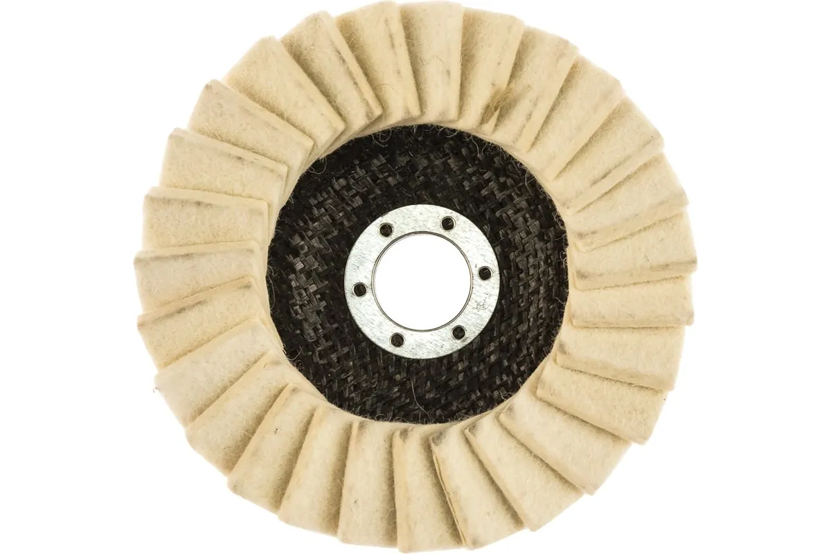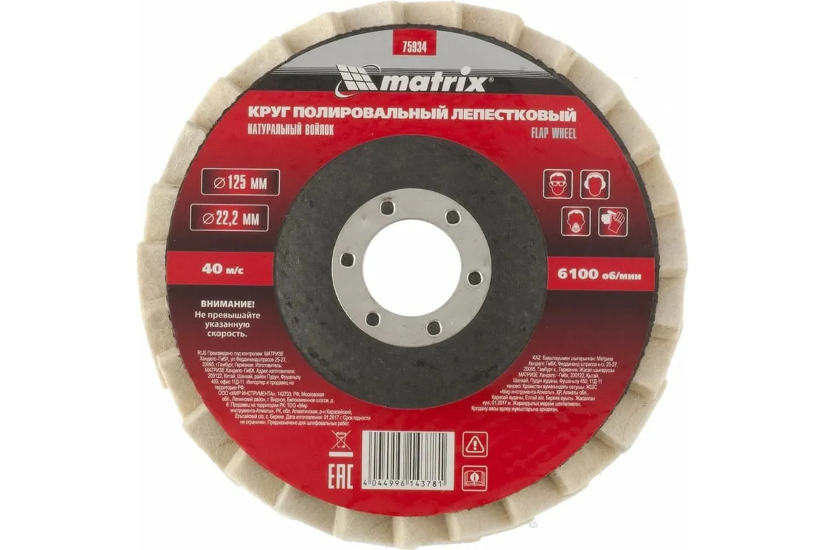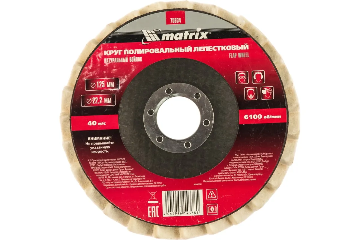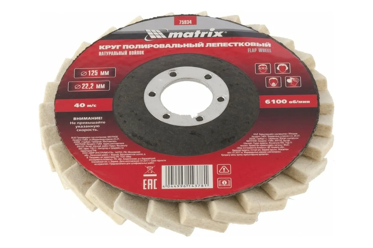 Лепестковый полировальный круг из натурального войлока Matrix 75934, 125 х 22,2 мм предназначен для обработки поверхностей из стали, цветных металлов, стекла, пластика, камня и др. Он является оснасткой для УШМ (болгарки) и применяется в строительстве, ремонте, для кузовных работ, а также в быту.