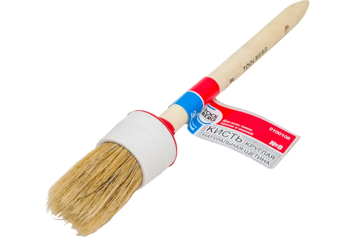 Круглая кисть Toolberg №8 0100108 подходит для сложных работ при окрашивании профилированных деталей. Специальная форма рабочей части вместе с плотным обжимом гарантирует длительный срок службы.Рукоять не проскальзывает в ладони, имеет соответствующий профиль для удобной эксплуатации инструмента. Щетина обладает хорошей впитываемостью.