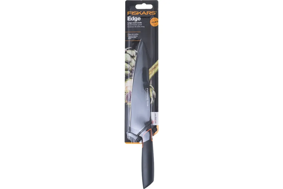 Кухонный нож Fiskars Edge 1003094 имеет твердость 53 HRC. Можно использовать при обработке любых продуктов.