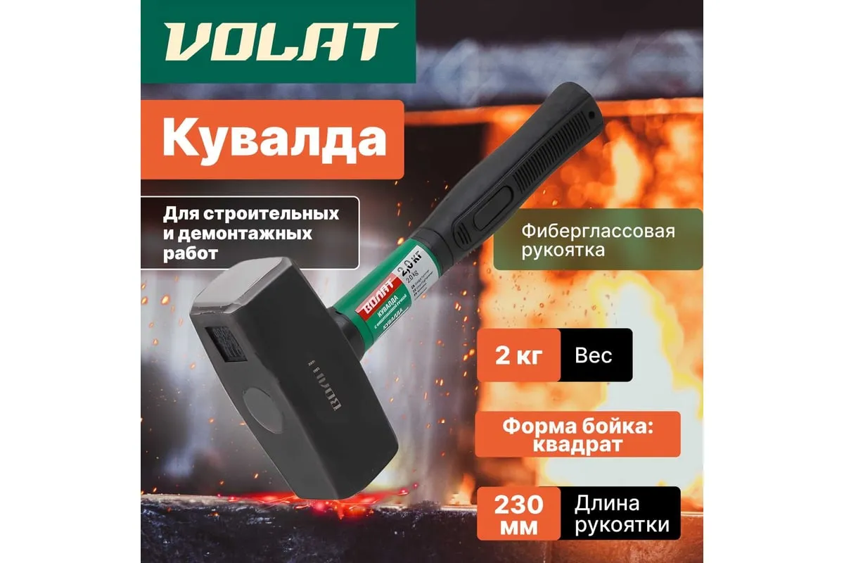 Кувалда ВОЛАТ 2 кг 10530-20 подходит для демонтажных и монтажных работ. Обеспечивает мощный удар и возможность для сильного замаха. Рукоятка не скользит в ладонях, что повышает безопасность использования инструмента.
