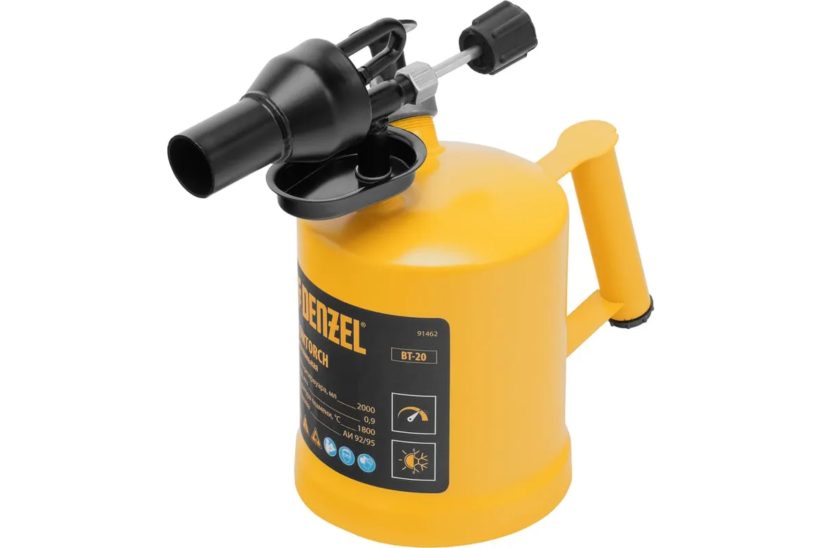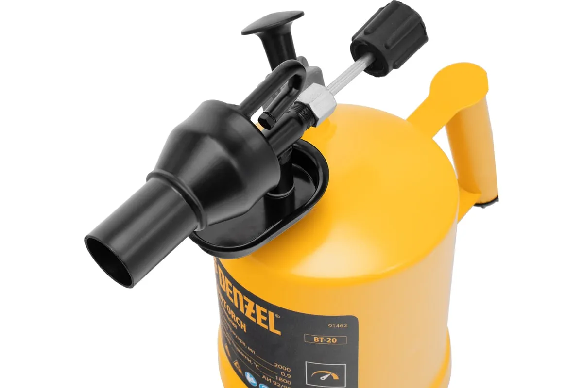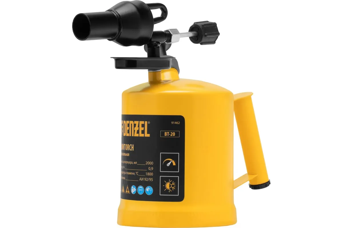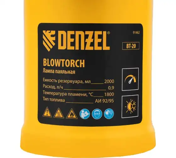 Паяльная лампа Denzel BT-20 91462 с баком объемом 2 л предназначена для нагрева поверхностей при помощи открытого направленного пламени. Полной заправки (1,5 л топлива) хватает больше чем на час работы при расходе 0,9 л/ч. Воздушный насос и форсунка высокого давления обеспечивают эффективную подачу топлива к эжектору. Лампа стабильно работает даже в ветреную погоду. Используется при выполнении ремонтных и демонтажных работ: пайки, сварки, ослаблении заклинивших резьбовых соединений, опаливании древесины, снятии лакокрасочных покрытий и других термических работ. Пригодится для обогрева двигателя. Также будет полезна в сельском хозяйстве и в быту.